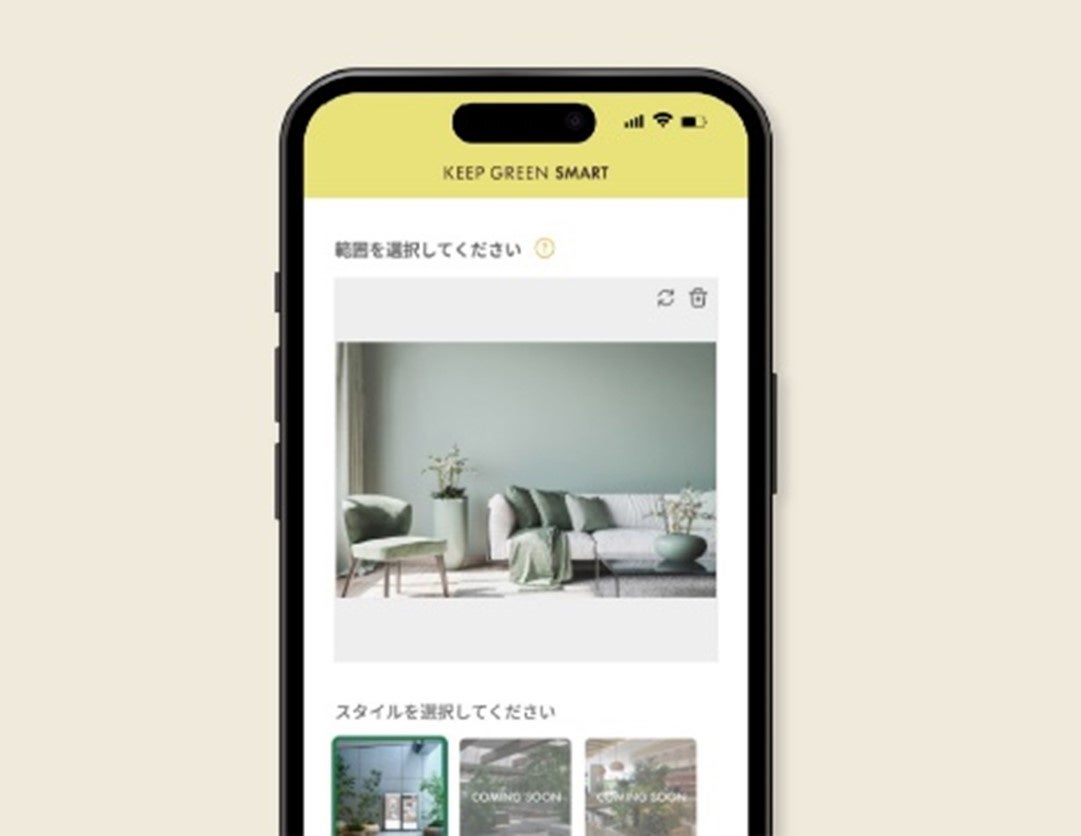 植物コミュニティアプリ「GreenSnap」を運営するGreenSnap 株式会社(本社:東京都中央区、代表取締役:西田貴一)の開発した、オフィスや店舗など屋内のグリーンデザインに特化した AI エンジン「indoorgreenAI(インドアグリーンエーアイ)」を用いて共同開発したサービスです。さまざまな空間に対して緑の入ったビジュアルを生成し、KEEP GREEN の施工によって実現されるグリーンライフを提示します。