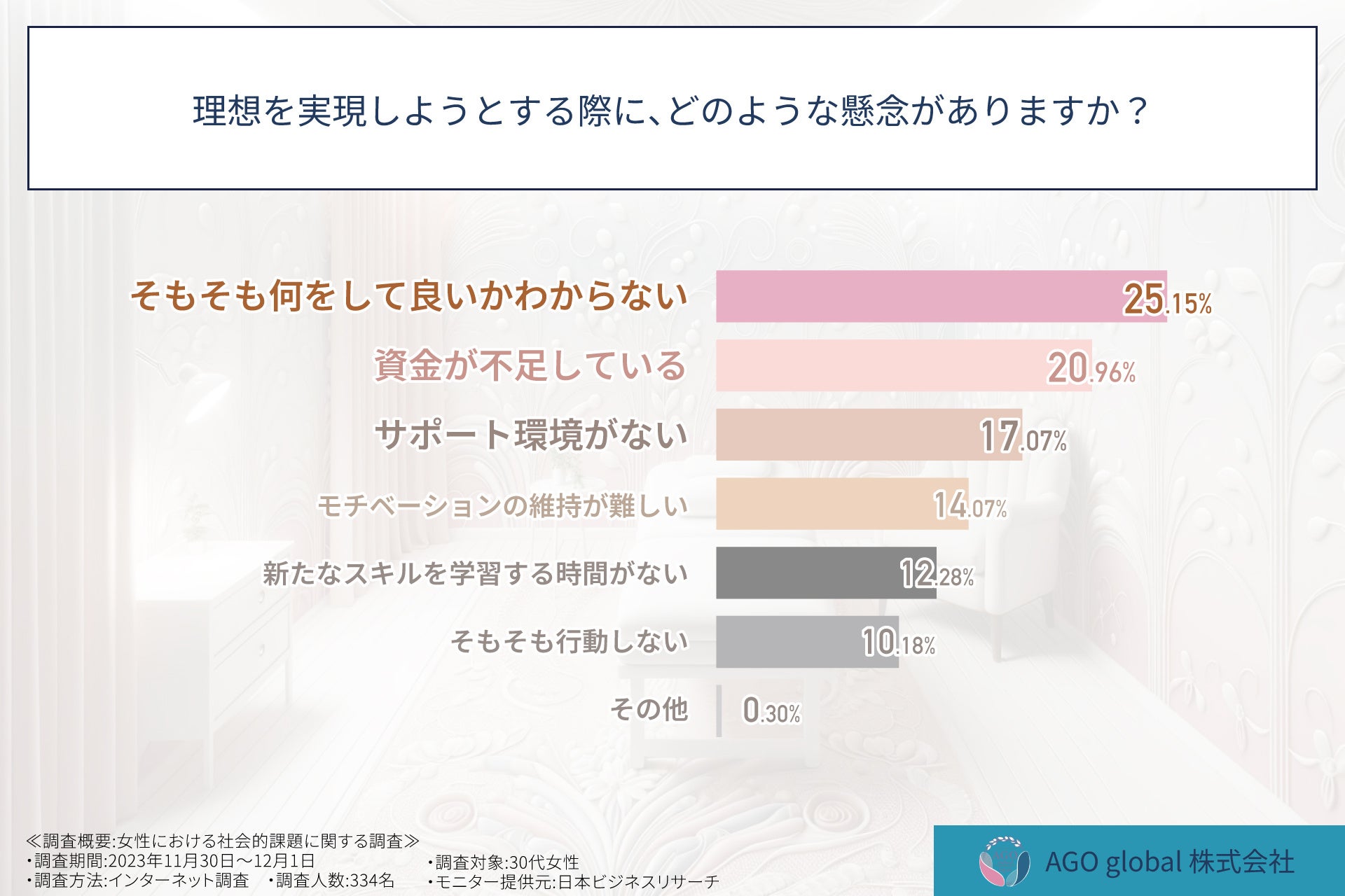 理想の女性像の実現のために、労働・家庭環境を改善したり、自分自身のスキルと磨き専門知識を取得したり、といった方法が上げられましたが、それを実践する上での懸念点を調査しました。