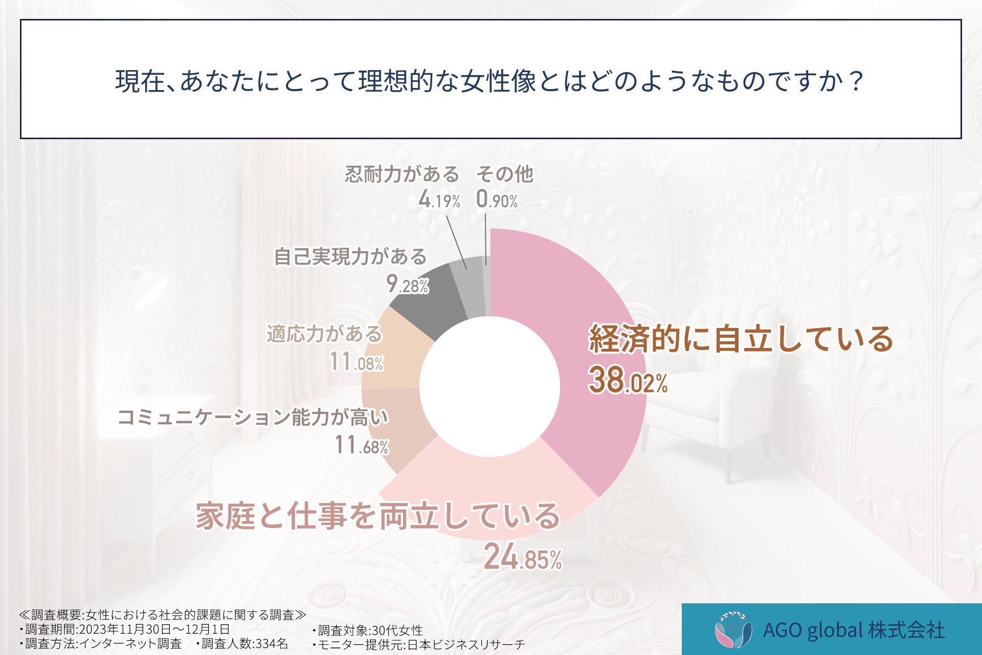 ただ、一方で理想の女性像としても、同じく「経済的に自立している」女性や「仕事と家庭を両立している」女性が票を集め、社会的課題がある中でも自立していきいき働く女性が理想像として掲げられていることが分かりました。