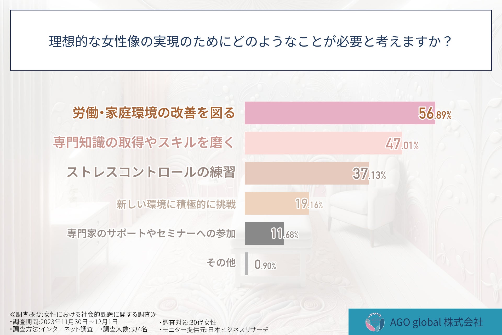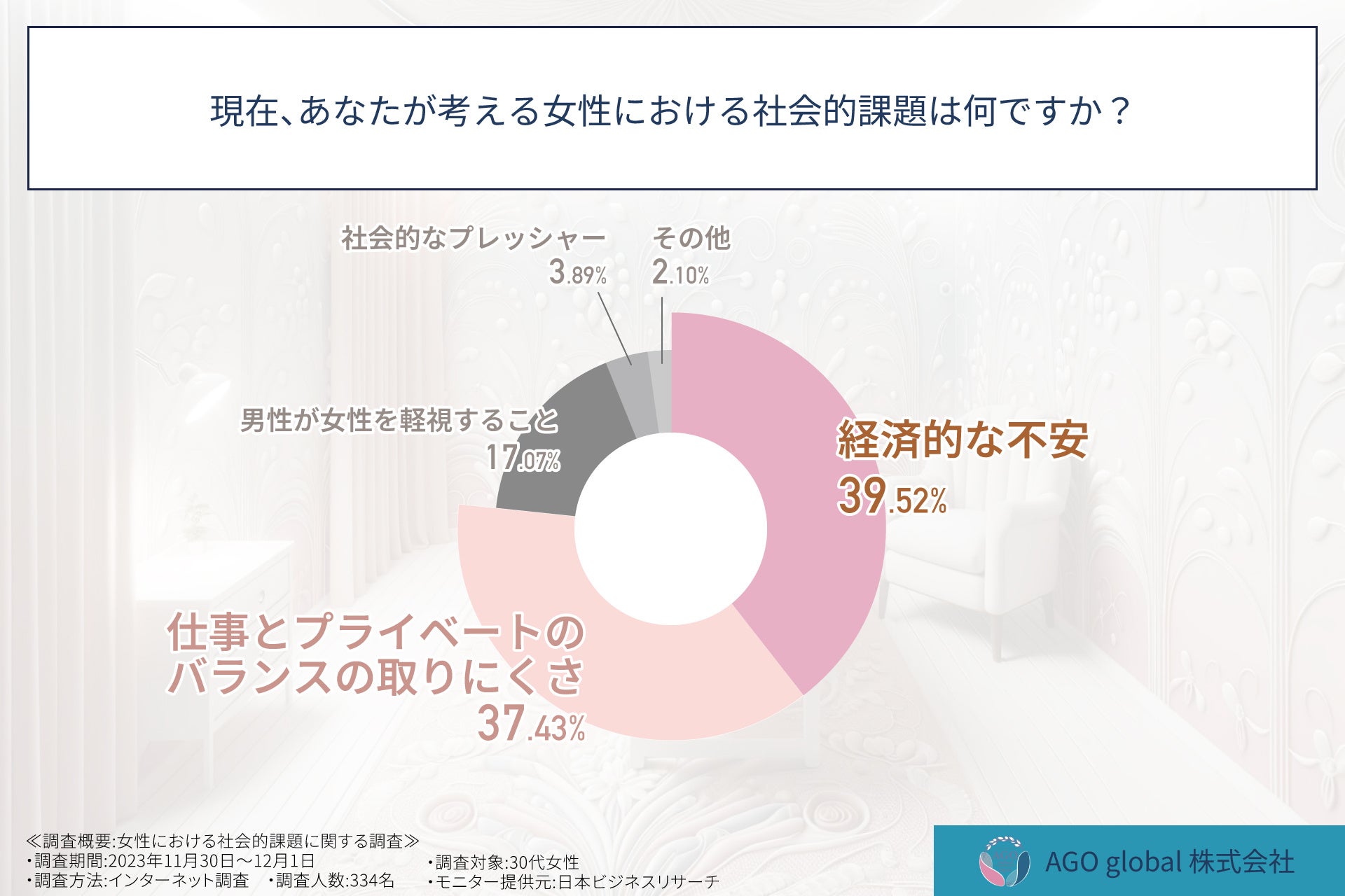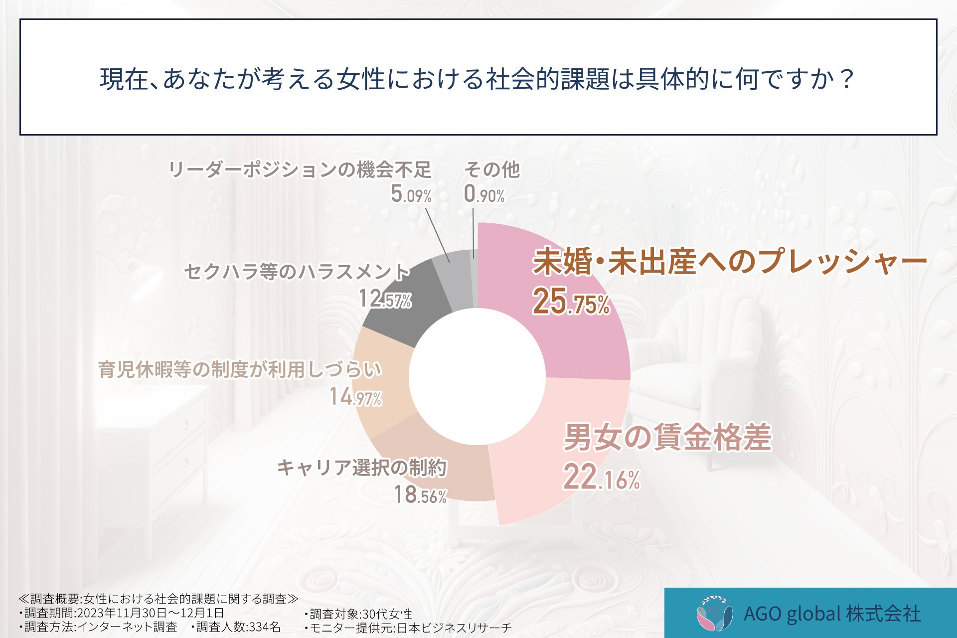 そこで、AGOセラピストスクール(URL:https://agoglobal.co.jp/lp/)は、30代の女性に対し、女性の社会的課題についての意識調査を実施しました。
