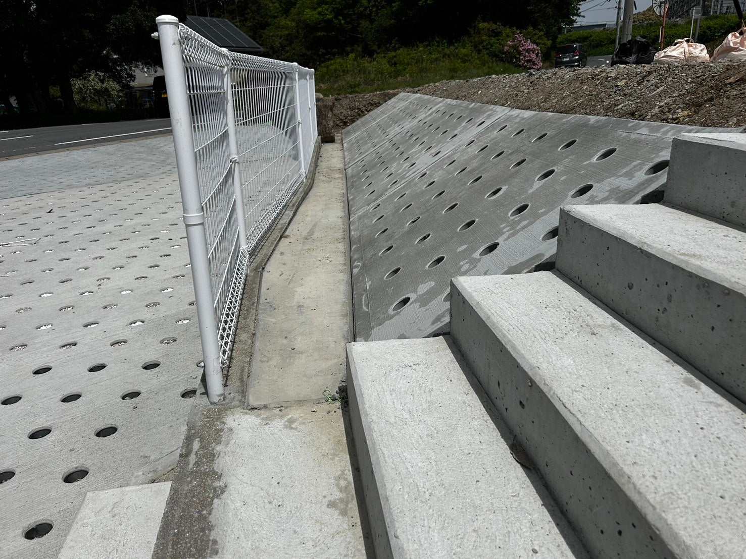 今年開催される国スポに向けて、多くの来客が予想される中、メイングラウンドのバックネット裏(観客席)が地盤沈下などにより危険な状態で見た目も悪化していました。これに対し、設計から施工までの依頼を受け、Dotconが設計に採用されました。