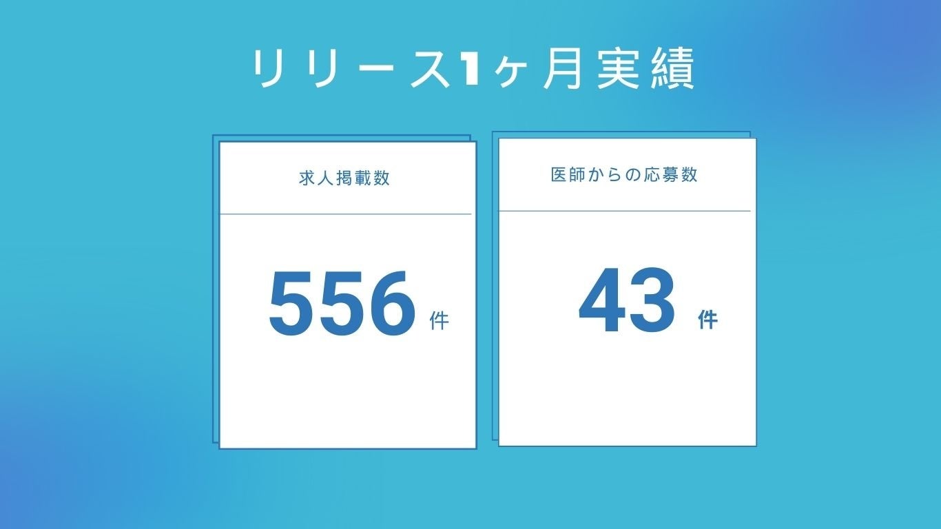 医療機関側は、約1ヶ月で250施設超えが登録しました。『Med-Pro Doctors』は、独自の評価システム導入と、求職者と直接メッセージできる機能、さらに掲載費用・紹介費用・採用費用等の全てが完全無料であり、採用コスト削減とプロフェッショナルな医師の採用の両方を確立しています。効率的な求人募集で大量採用が求められる医療法人グループも初期から利用しています。そのほか、診療所やクリニック、介護施設にも好評です。特に今まで高額な採用コストを要したが、遂行業務に対しスキルが足りない医師や患者対応・勤務態度が悪くクレームになるケースが多くありました。『Med-Pro Doctors』はこの医療業界の抱える問題を解決しています。現在、求人掲載数556件・医師からの応募数43件であり、利用した医療機関からは「評価システムがあるので、医師が今までよりも良いサービスを提供してくれ、看護師の評判が良かったです。かつ採用コスト完全無料なので、本当に登録して良かったです!」との声を頂いてます。完全無料でプロフェショナルの医師を採用しませんか?