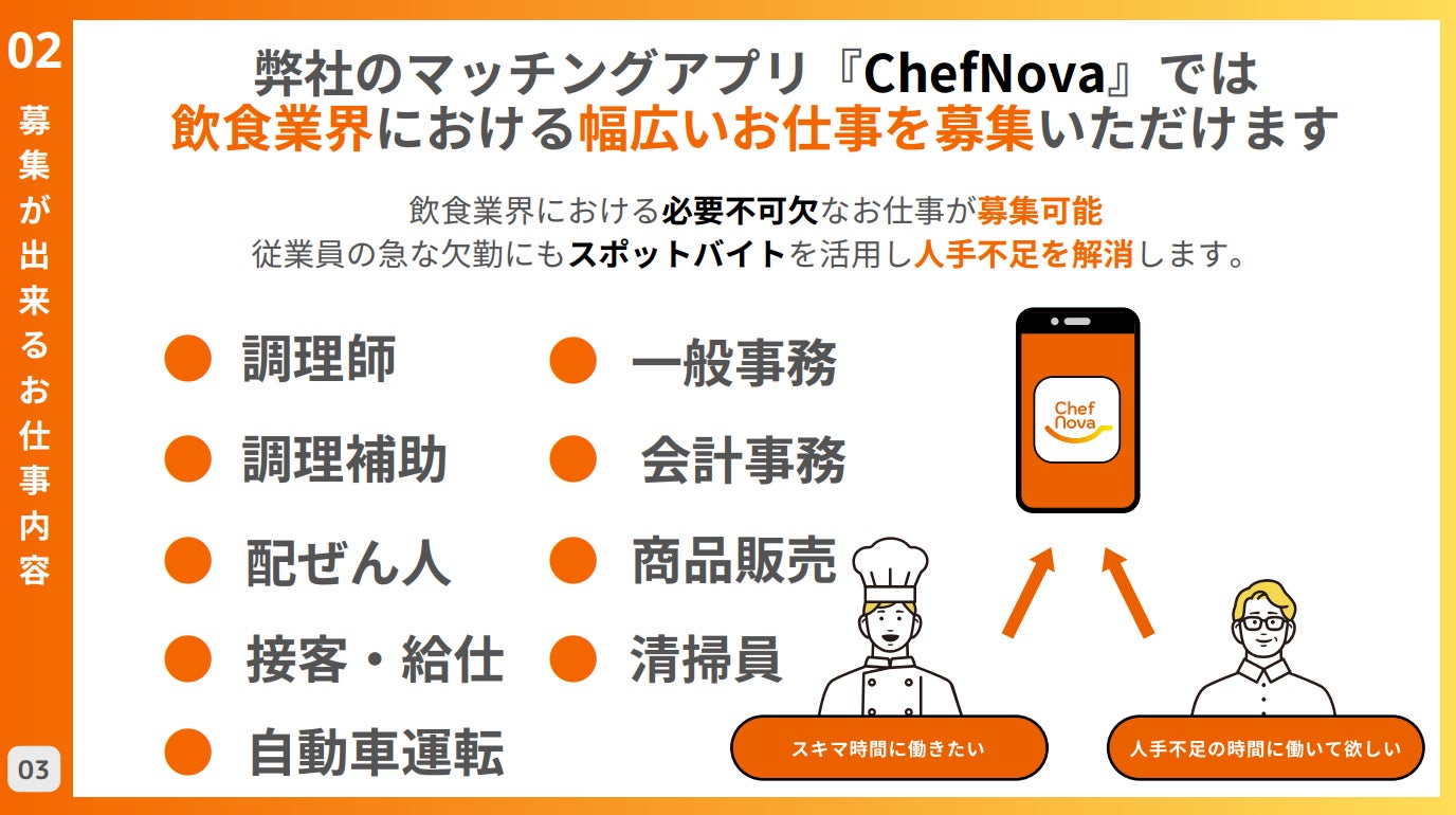 このような背景を踏まえ、ChefNovaは利用料無料キャンペーンを実施中です。ChefNovaは、数時間単位で求人を出せる飲食特化型のスポットバイトアプリです。飲食店が必要なときに、必要なスキルを持つシェフや料理人を簡単に見つけることができます。