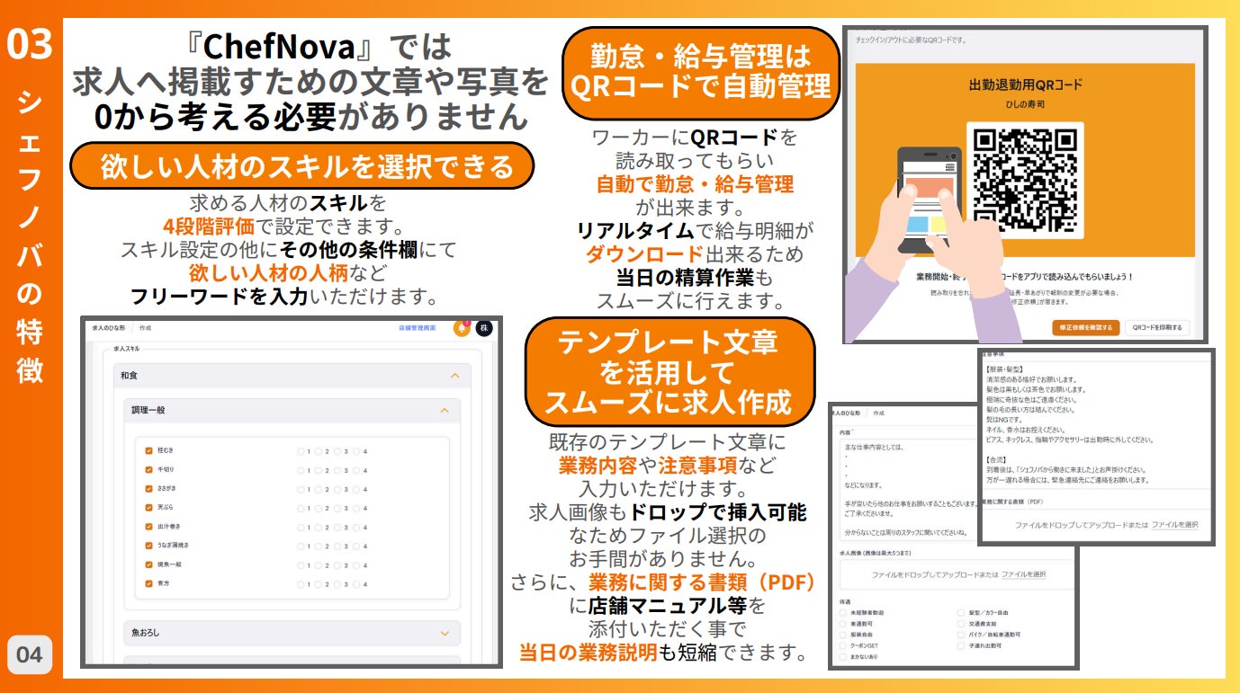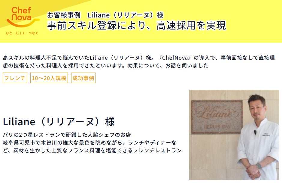 技術を持った料理人の頭数が減少傾向にある昨今で、欲しい日に、欲しい技術の方に援助いただけるサービスとのことで、そんなサービスがあれば是非取り入れたく、今回ChefNovaを導入しました。