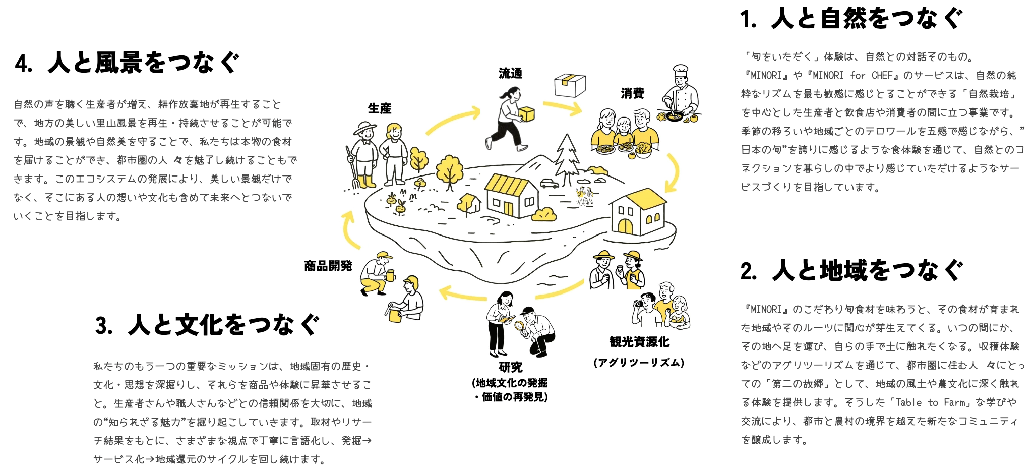 「未来に“おいしい”を残す」唯一の選択肢として、環境を再生する方法として自然栽培や在来種の種継ぎがある。私たちは、アカデミアとの共同研究を推進し、環境を保つと言われている「小規模生産者や家族経営農業」など、「minori-ty(マイノリティ)」生産者が輝く場所を目指しています。