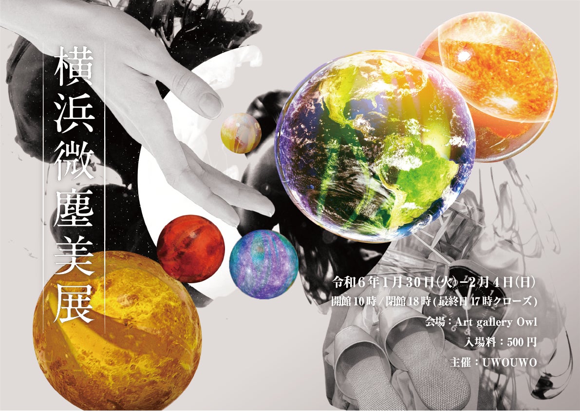 アートユニットUWOUWO(坂根大悟+市川しょうこ)は、2024年1月30日(火)〜2月4日(日)に横浜のアート・ギャラリー アウルにて個展『横浜微塵美展(ヨコハマミジンビテン)』を開催します。本展で展示する作品は、化学者と映像作家がコラボレーションした科学装置インスタレーションです。科学と映像を組み合わせることにより、ホコリが星のように煌めき出し、手のひらから発生するモヤが突然見えてくる展示を行います。普段、目にするホコリや手のひらを通して、世界中に争いが広がる混乱の世の中だからこそ、最も身近な部屋の中にある美しさを見つめ直します。