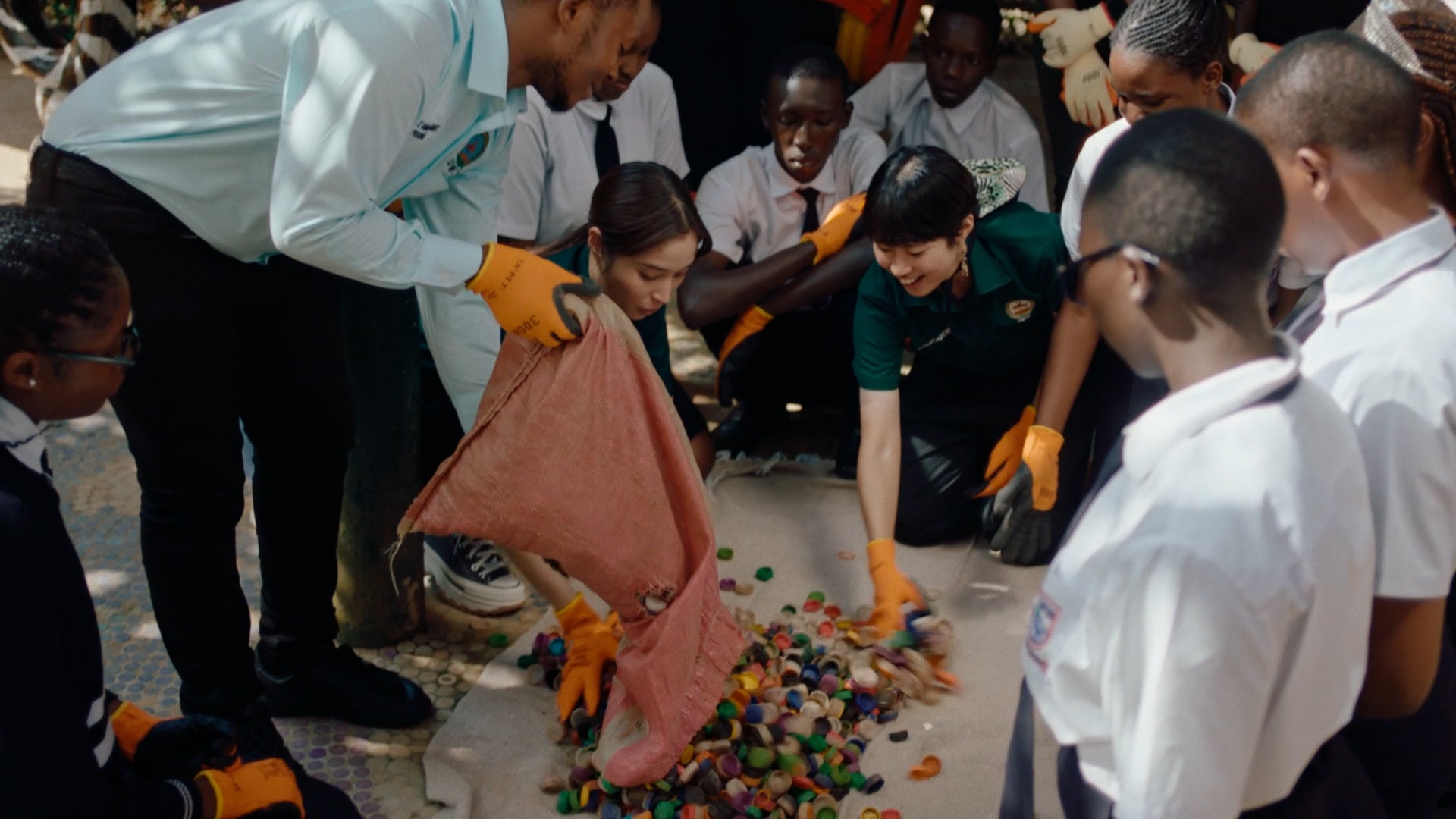 その後、子どもたちの前でウガンダの現地の言葉(ルガンダ語)で挨拶をし、現地の子どもたちとペットボトルの蓋で日本の国旗を作る楽しそうな広瀬さんや、一転して、真剣な表情でビーチでゴミ拾いをする姿も見られます。後半は、公園の遊具で遊び、子どもたちと一緒になって大はしゃぎする様子も見られます。