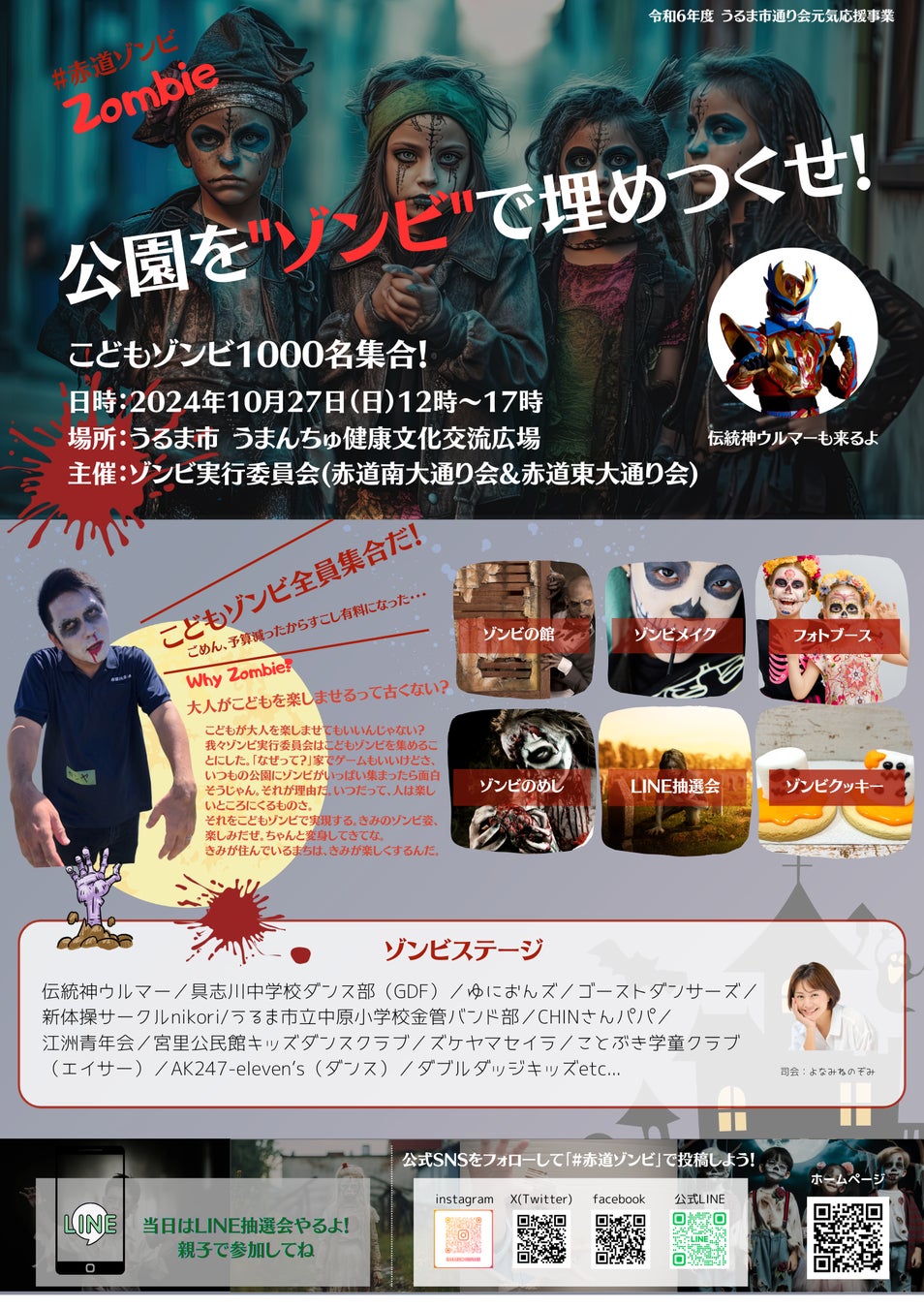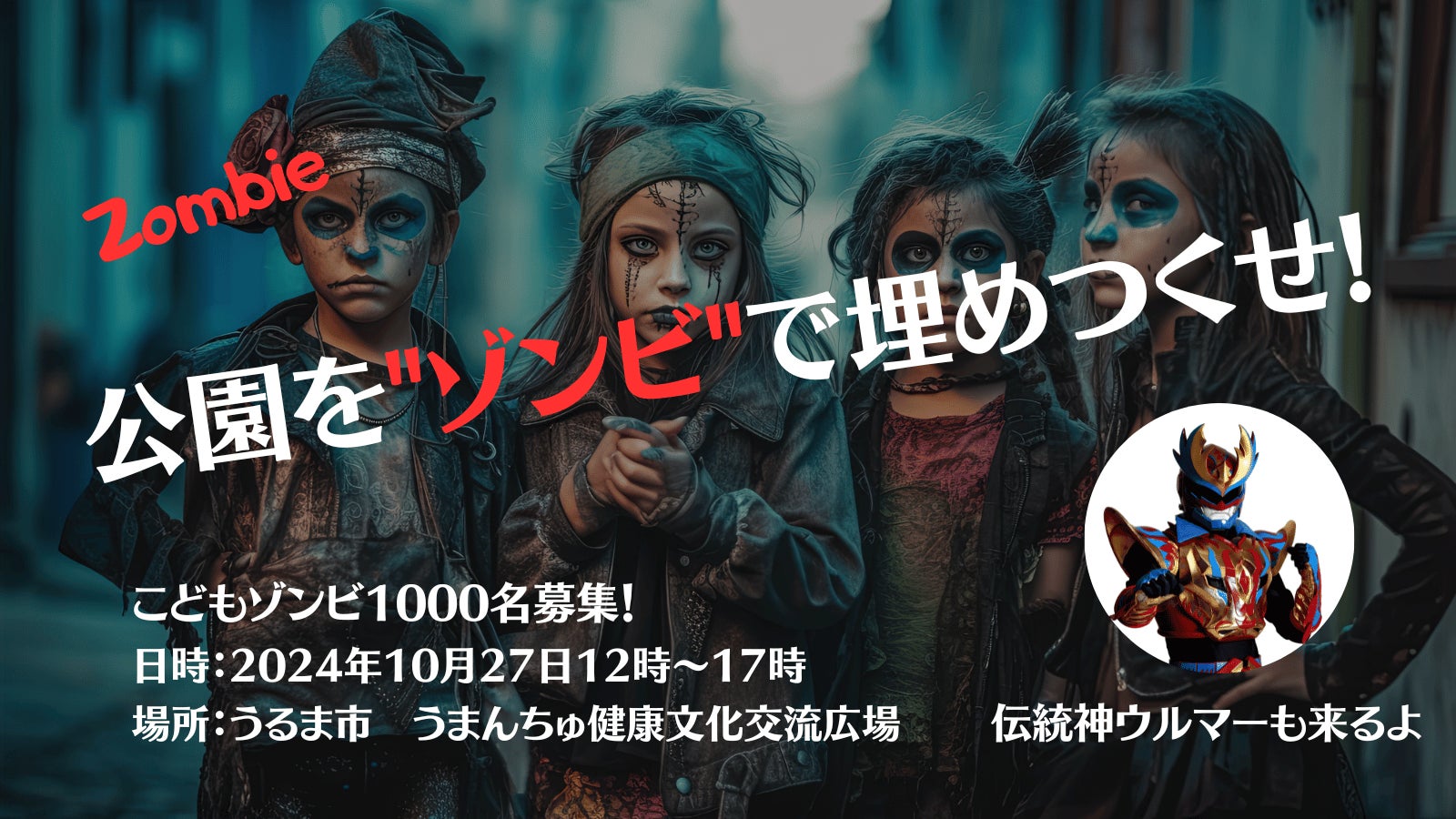 2024年10月27日、うるま市の公園がゾンビで埋め尽くされます!ゾンビの館、ゾンビメイク、クッキー作り、ステージなど、子どもたちが主役の楽しいハロウィンイベントが盛りだくさん。伝統神ウルマーも登場。