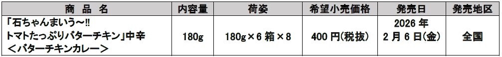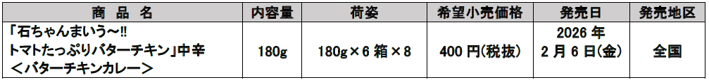 平和食品工業株式会社は、市販用レトルトカレー「石ちゃんまいう~!! トマトたっぷりバターチキン」中辛<バターチキンカレー>を2月6日より全国で新発売 します。昨年発売の「石ちゃんまいう~!! もーもーカレー」「石ちゃんまいう~!! ぶーぶーカレー」に引き続き、石ちゃんまいう~‼カレーシリーズ3品目として新登場!トマトのコクと酸味のバランスにこだわった一品です。パスタにもごはんにも相性バッチリなバターチキンカレーです。