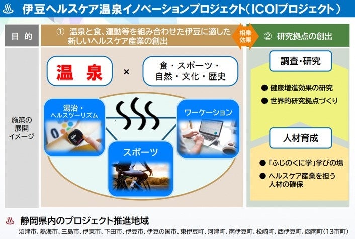 温泉については、2023年1月より、伊豆地域の豊かな温泉資源を活用し、食やスポーツなどと組み合わせた、新しいヘルスケア産業を生み出すための事業「伊豆ヘルスケア温泉イノベーション(ICOI:イコイ)プロジェクト」(https://www.pref.shizuoka.jp/sangyoshigoto/kigyoshien/shuseki/1056327/index.html)をスタートしました。ICOIプロジェクトでは「湯治・ヘルスツーリズム」「スポーツ」「ワ―ケーション」の3つの柱を立て、温泉の健康増進効果を科学的に検証・数値化し、その根拠をもとに、県が市町や地域の企業・団体と協力しながら、伊豆に適した新しいヘルスケア産業を創造します。
