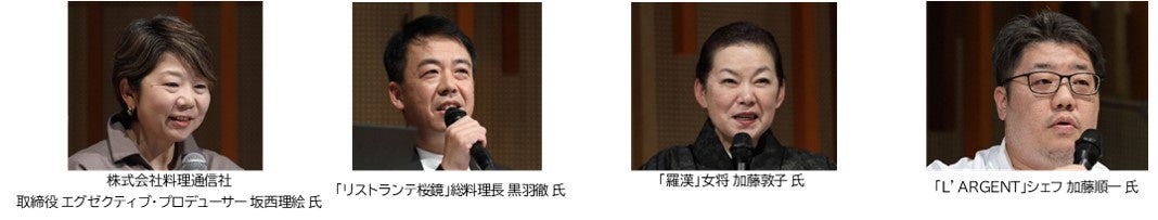 株式会社料理通信社 取締役 エグゼクティブ・プロデューサー・坂西理絵氏をモデレーターに迎え、イタリアンの「リストランテ桜鏡」の総料理長・黒羽徹氏、1日限定1組の創作和食「羅漢」の女将・加藤敦子氏、北欧料理のエッセンスを取り入れた1つ星レストラン「L’ARGENT」のシェフ・加藤順一氏が、ガストロノミーツーリズムに必要なことは、地元の生産者との信頼関係をはじめ、地域性を活かした料理の提供方法などにも工夫を凝らすことが重要であること等のお話をいただきました。