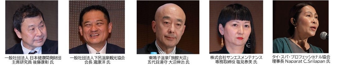また、温泉地の活性化をテーマに、一般社団法人 日本健康開発財団 主席研究員・後藤康彰氏、一般社団法人下呂温泉観光協会 会長・瀧康洋氏、東鳴子温泉「旅館大沼」五代目湯守・大沼伸治氏、株式会社サンエスメンテナンス 専務取締役・塩見泰美氏、タイ・スパ・プロフェッショナル協会 理事長・Naparat C.Srilapan 氏より、温泉を中心とした多様なサービス・産業連携について取り組み事例等をご紹介いただきました。