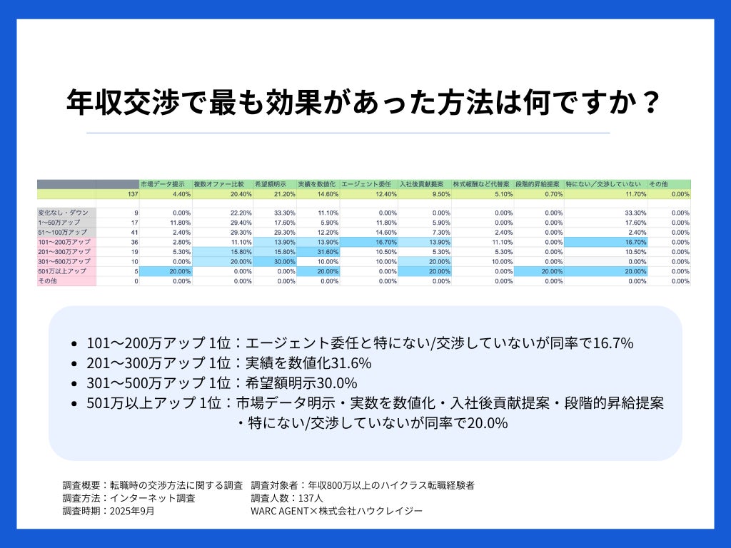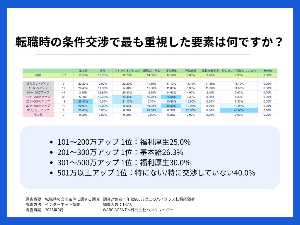 ハイクラス転職エージェントの「WARC AGENT」を運営する株式会社WARCは、株式会社ハウクレイジーと共同で年収800万以上のハイクラス転職経験者137名を対象に、「ハイクラス転職での年収変化と交渉戦略」に関するアンケート調査を実施しました。今回の調査から、年収アップの実態や効果的な交渉方法、重視すべき要素といった管理部門のハイクラス転職者の傾向が見えてきました。