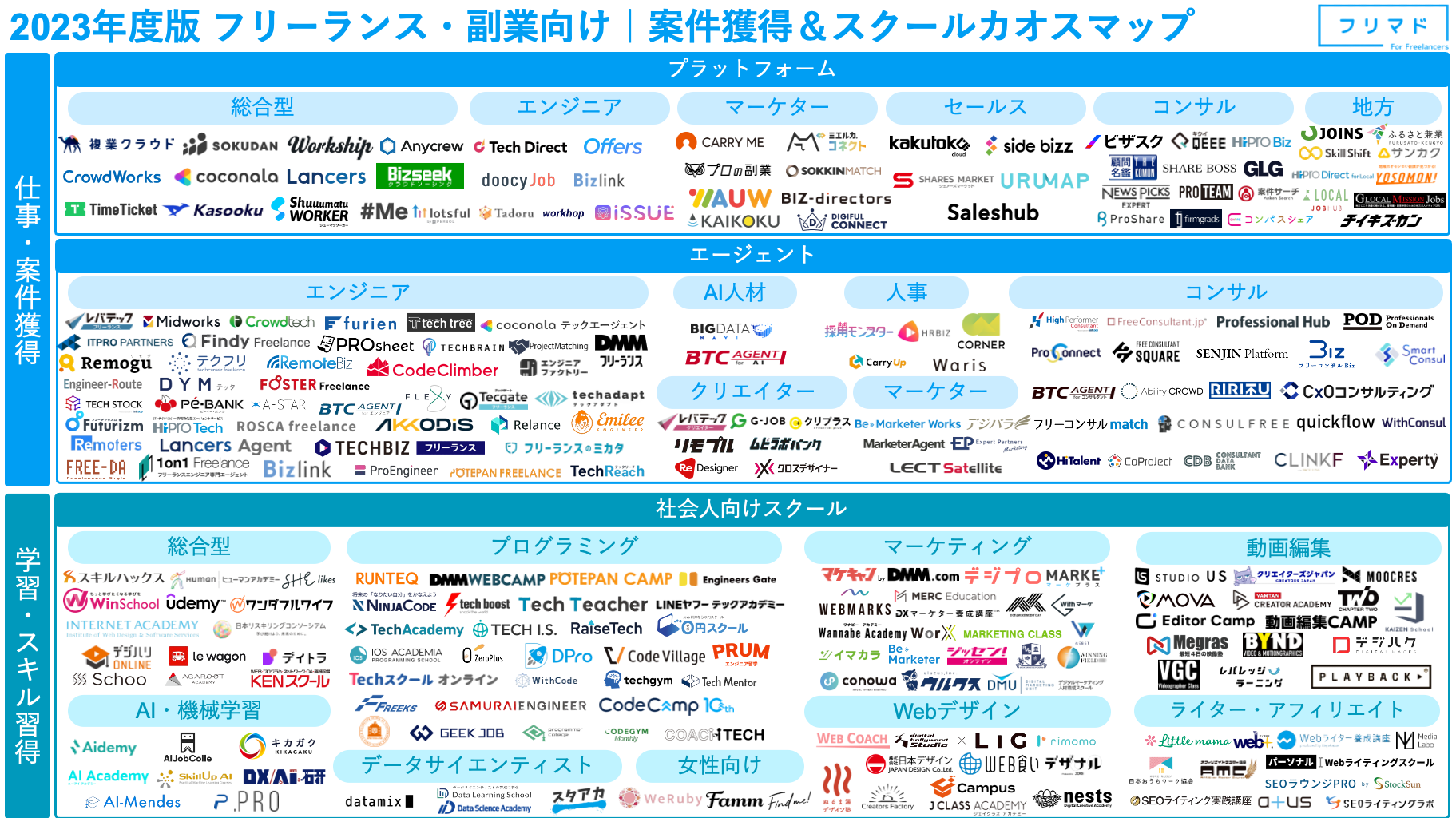 フリマド、「フリーランスや副業向けのスクール・案件獲得カオスマップ」を公開