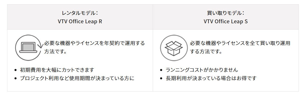 今回の最新バージョンより、2つの導入方法を採用しました。親拠点PCと必要なライセンス、保守サポートをセットにしたレンタルモデルの「VTV Office Leap R」と、買い取りモデルの「VTV Office Leap S」の2モデルから、短期間利用の場合や初期導入費を抑えたい場合は「レンタル」、ランニングコストを抑え長期利用にはお得な「買い取り」と柔軟に導入方法をご選択いただけます。また、1拠点単位でアカウントを追加できるように価格設定を見直しました。(最小導入数は2拠点から、最大導入数は9拠点まで)これにより費用は必要な拠点数分だけとなり、コストパフォーマンス良く導入が可能になります。