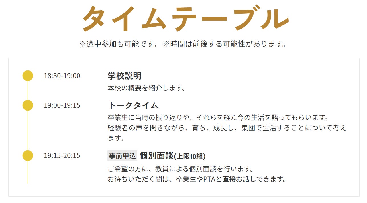 当日は、「教育講演(学校説明+トーク)」と「個別相談会」の2部構成となっており、現役教師との「個別相談会(限定10組まで)」には事前申し込みが必須となります。