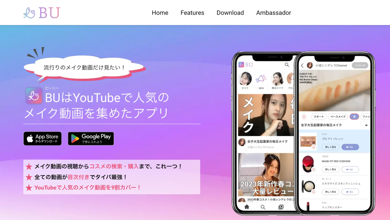 「メイク動画を革新的に見やすくするアプリ」の名称です。早稲田大学と文部科学省のプログラムで最優秀賞を獲得し開発されました。トレンドのメイク動画を集め、見づらさを網羅的に解決し、「ビーユー」はメイクを通じて自分らしさを愛せる人を増やすことをミッションとして、世界No.1のメイク動画アプリを目指しています。
