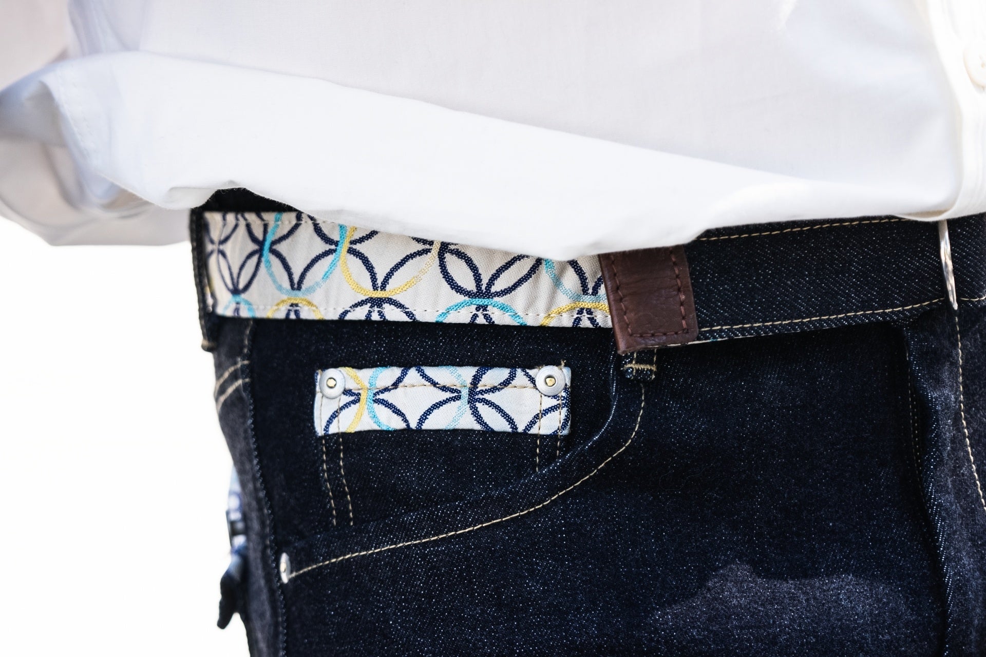 和デニムでは、西陣織の華やかさを残しつつも、派手になりすぎず、普段の街着でもカジュアルなビジネスシーンでも、トップスに合わせやすい紋様を七宝柄で表現しました。色数が多く緻密に織られる西陣織は少量生産のため希少性が高く、和デニムに使われている七宝紋様は、京都西陣の職人が丁寧に仕上げた完全オリジナルの西陣織です。