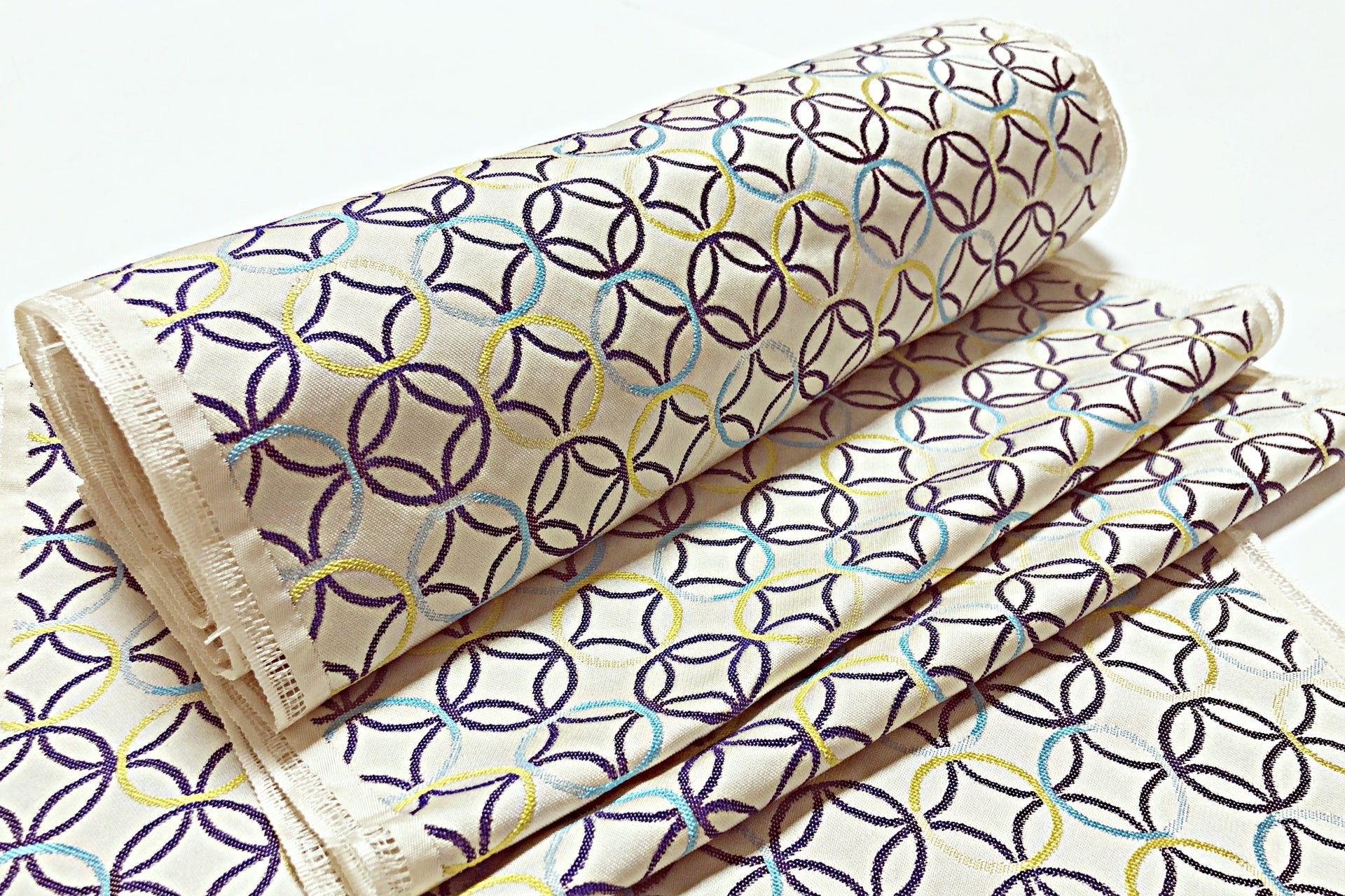 七宝紋とは、円形を四つ重ねてつないだ連続文様のことです。輪が四方に無限に広がっていくところから四方が七宝となったと言われています。また、仏教の七宝であるとも言われており、金、銀、瑠璃(るり)、波璃(はり)、珊瑚(さんご)、瑪瑙(めのう)、硨磲(しゃこ)の7つの宝のことを指します。文様の”円のつながり”は、”縁のつながり”とも言われ、円形が永遠に連鎖し繋がるため、「円満」「調和」「ご縁」の願いが込められた縁起のよい文様であり、人のご縁や繋がりは、七宝と同等の価値があることを示しているとも言われています。