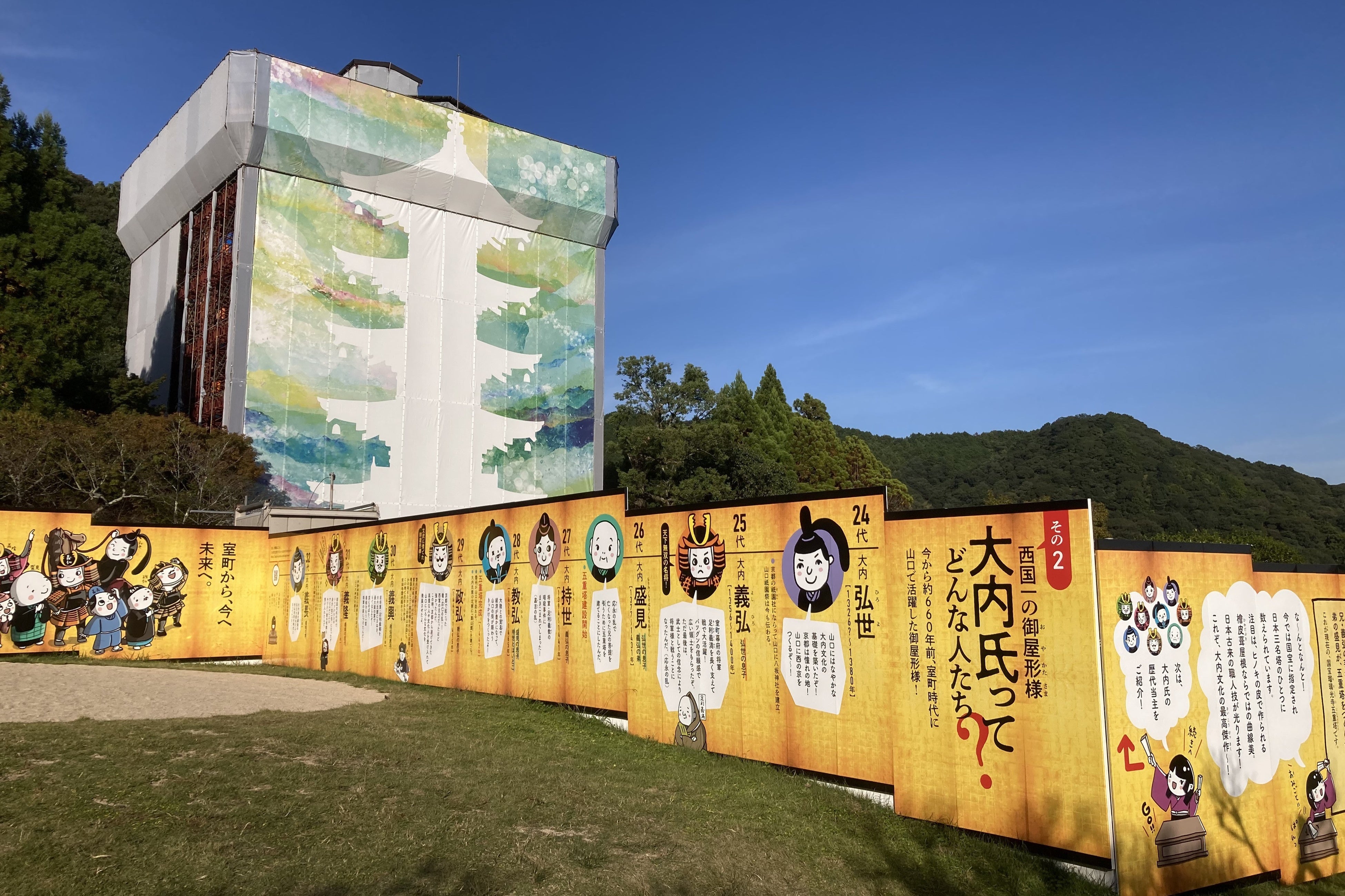 国宝瑠璃光寺五重塔の改修が進む香山公園で、空間アートプログラム「大内文化 思想をめぐる道」を開催中。1月19日からはプロジェクションマッピングも!光のアートで大内氏の思想を体感しよう!