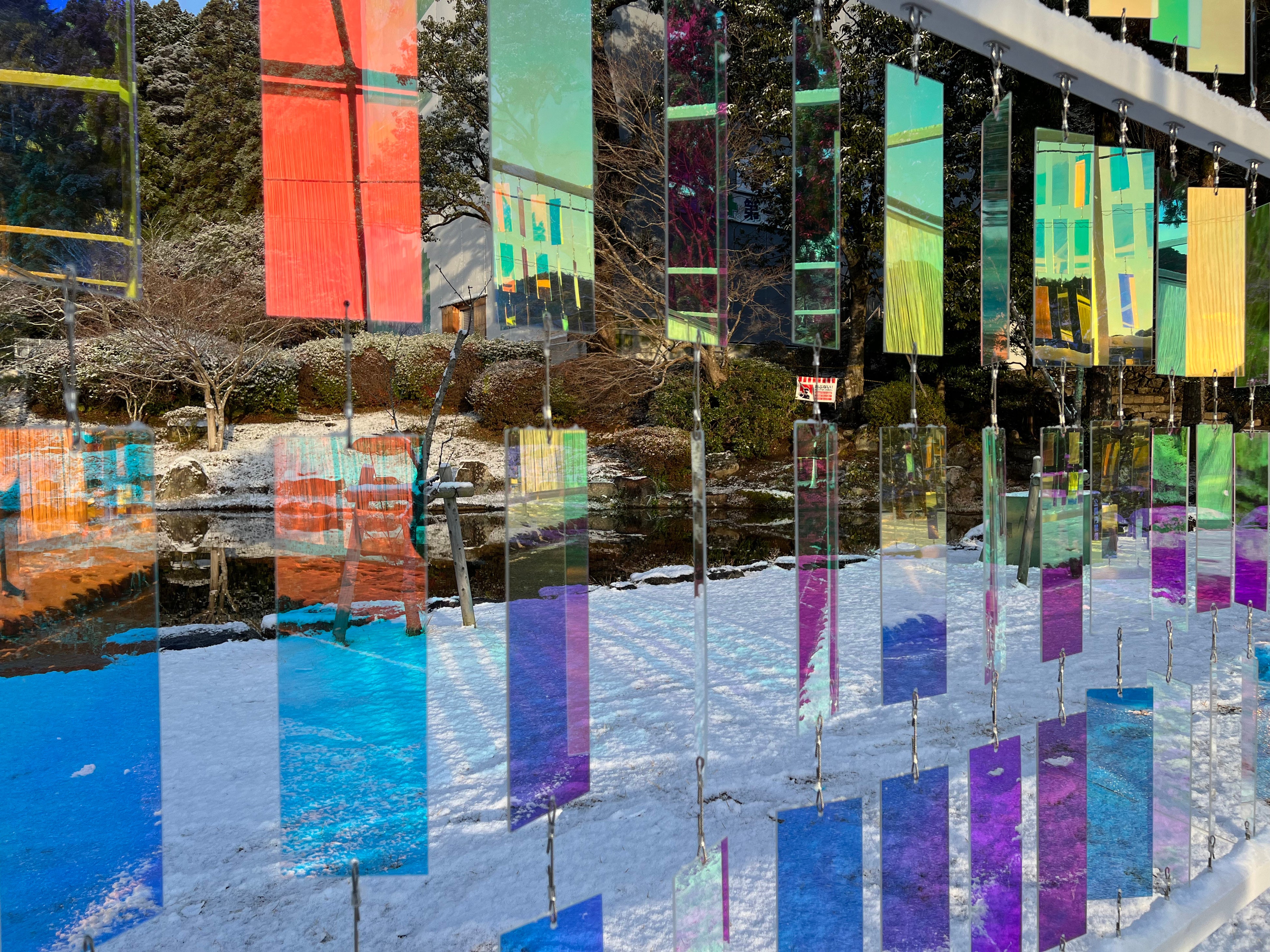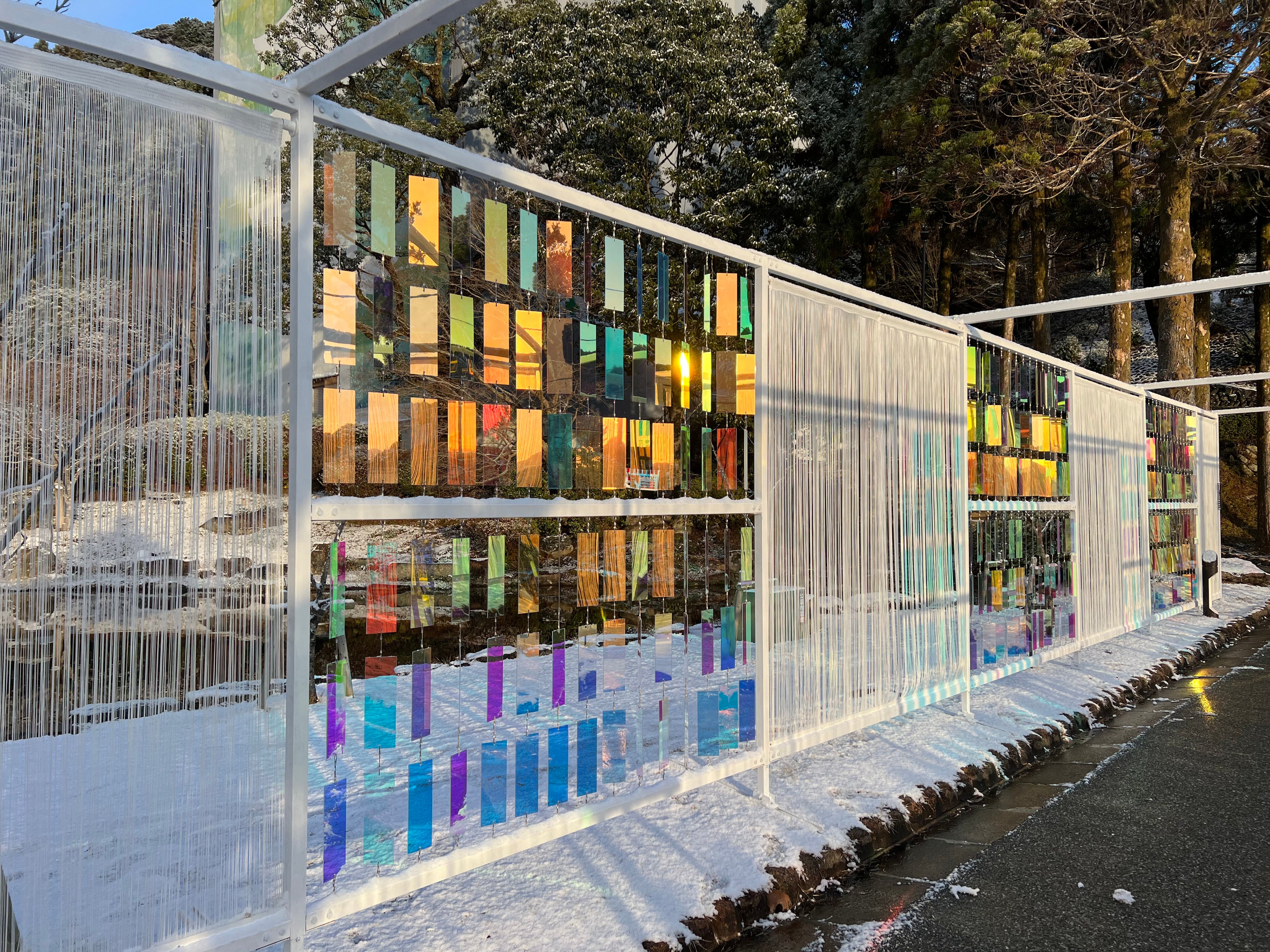 「大内文化 思想をめぐる道」は、香山公園塔影の池周辺通路約45mにわたり設置する、「和歌のカーテンゾーン」と「ステンドグラスゾーン」で構成する空間アートプログラムです。和歌とステンドグラスをモチーフとしたアート作品が、白いひも状のストリングスカーテンと共に空間を覆い、来場者を没入感ある体験へと誘います。