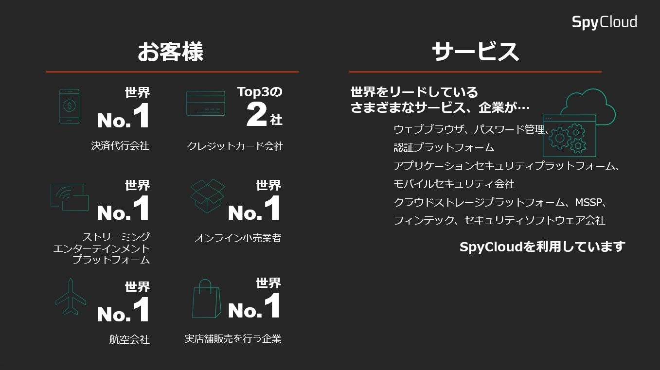 SpyCloudは、サイバー攻撃の防止、従業員と消費者のアイデンティティの保護、サイバー犯罪インシデントの調査を行う信頼できるパートナーとして、500社以上のB2B企業や消費者ブランドから選ばれています。