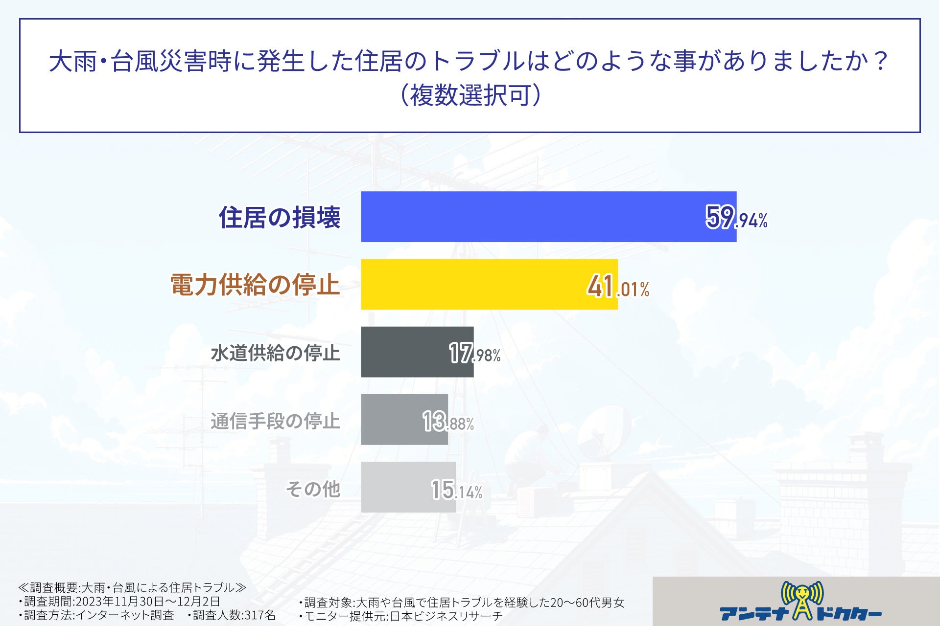 そこで、アンテナドクター(URL:https://antenna-dr.com/)は、大雨や台風で住居トラブルを経験した20~60代男女に対し、具体的なトラブル内容や事前対策の必要性などについて意識調査を実施しました。