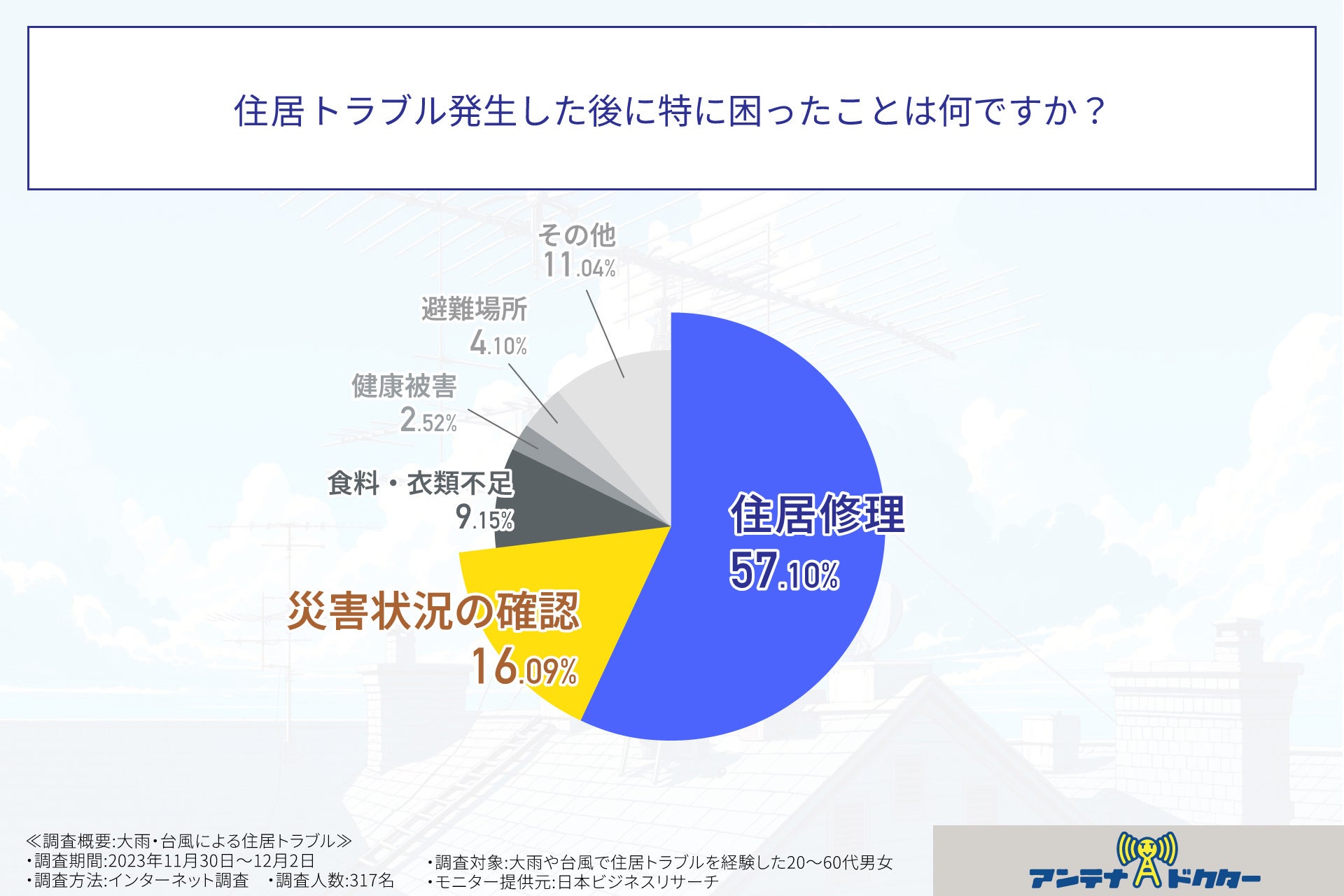 大雨や台風など、自然災害が起きた際に起こる住居トラブルでは、住居の損壊が6割近くを占め、その修理に困ったという人が多くいました。