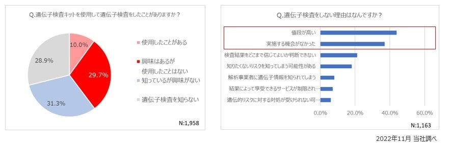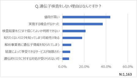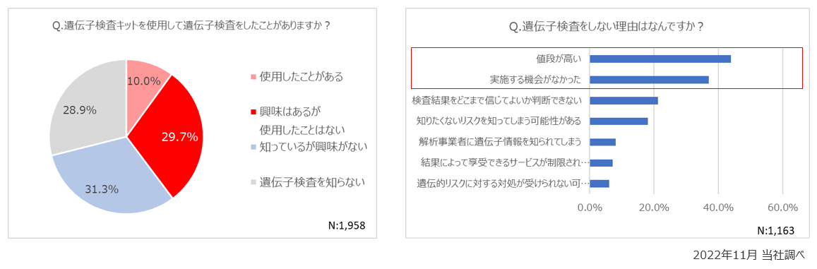 コロナ禍を経て唾液から自分の状態を知ることが一気に身近になりました。それに伴い、人々の健康意識や、自分自身についてもっと知りたいというニーズが高まり、ここ数年自宅でできる遺伝子検査の市場が急速に拡大しています。一方で、「遺伝子検査に興味はあるが、実施しない」という方が3割います。実施しない理由の1位は「価格が高い43.9%」、2位は「機会がない 37.0%」となっています。