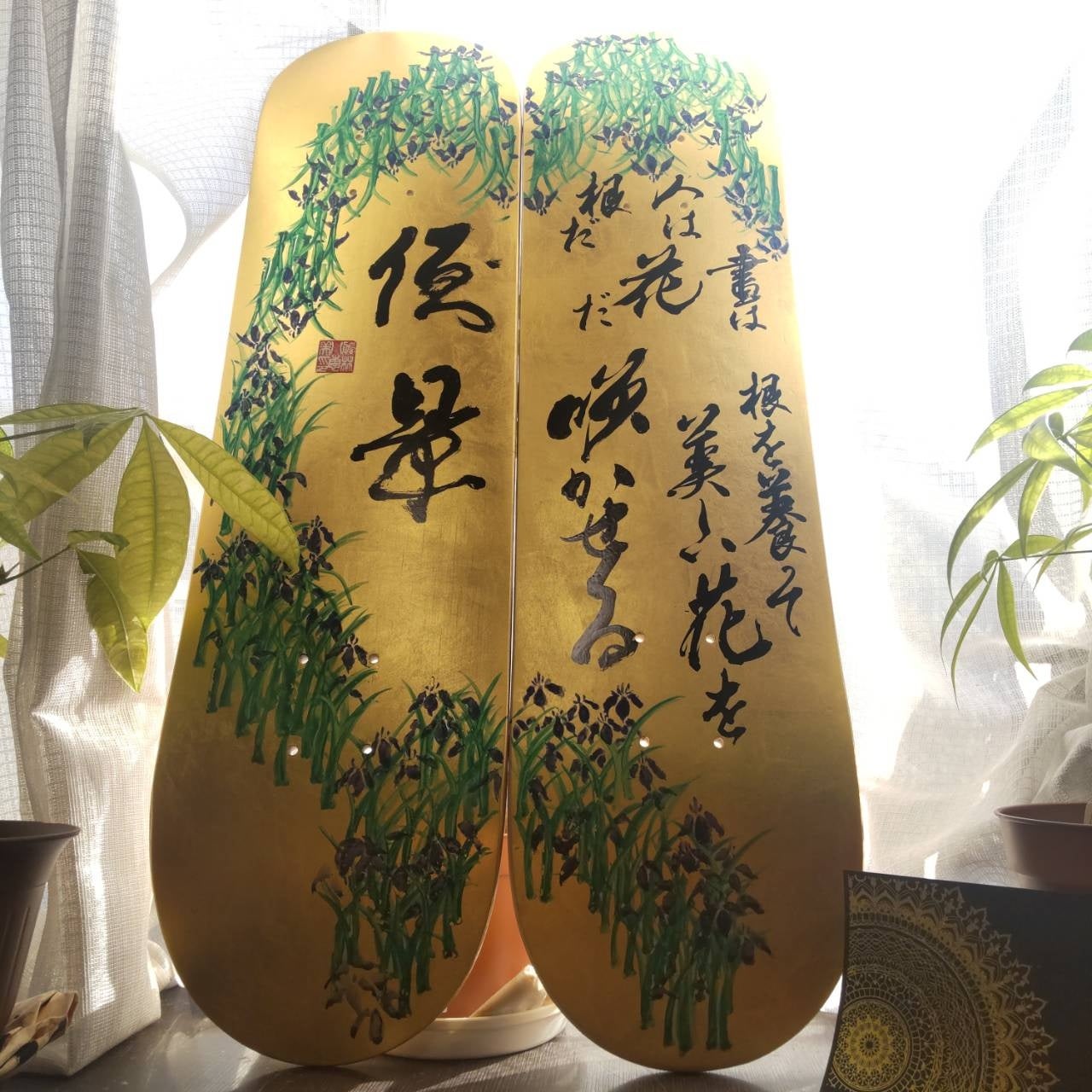◆スケートボード作品:現代的なスケートボードに漆や金箔を施した作品は、伝統とモダンが融合した新しい形の書道アート。