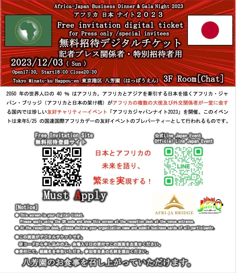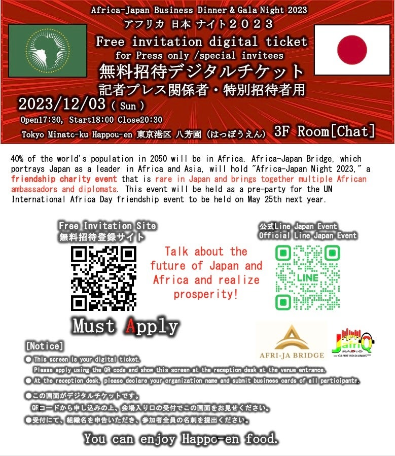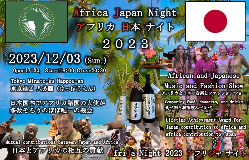 2050年の世界人口はアフリカが40%、アジアが40%、アフリカとアジアが、世界の80%を占めることになる。一方で、アジア、世界のリーダーとして活躍していく日本人にとって、アフリカは遠い国の印象です。アフリカの国々と日本の経済界のをつなぐ機会であるチャリティーイベント「アフリカジャパンナイト2023」を開催します。こちらは来年の国際アフリカデー(5/25)に行う予定のチャリティーイベントのプレパーティーであり、東京にいるアフリカの関係者と、日本とアフリカの共栄を願う人々が交流を図る絶好の機会です。 皆様が感じているように、日本におけるアフリカへの関心は、西洋諸国への関心に比して大きいものであるとは言えません。しかし、これからすごい勢いで成長をしていくアフリカに関心を持ち、交流を深めていくことは、お互いの成長のために重要であり不可欠です。このパーティーを、お互いを知るきっかけに、交流の糸口にしていただけたら幸いです。