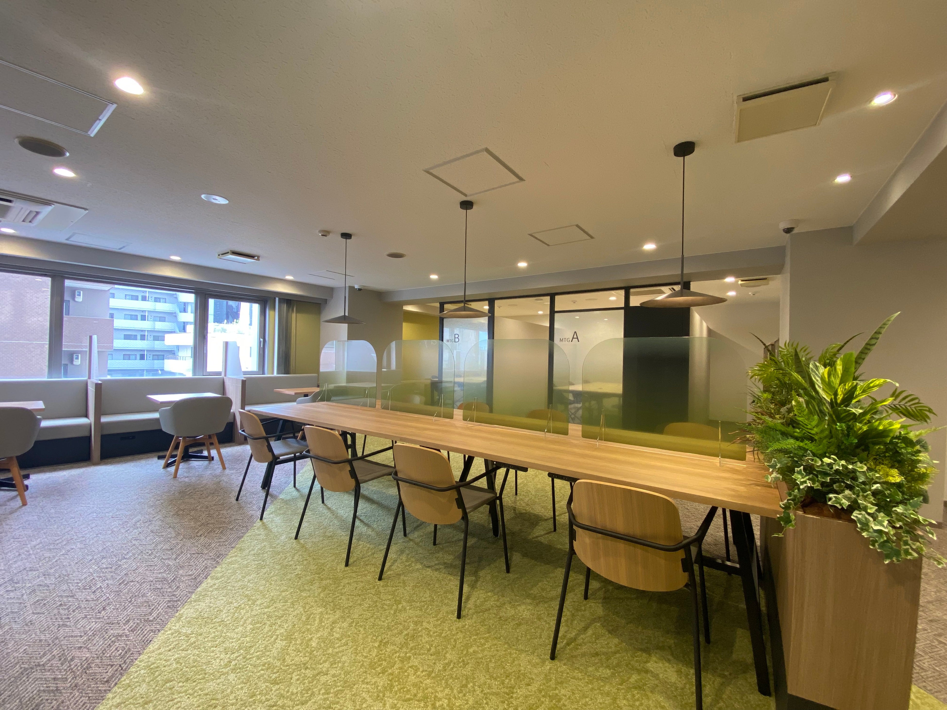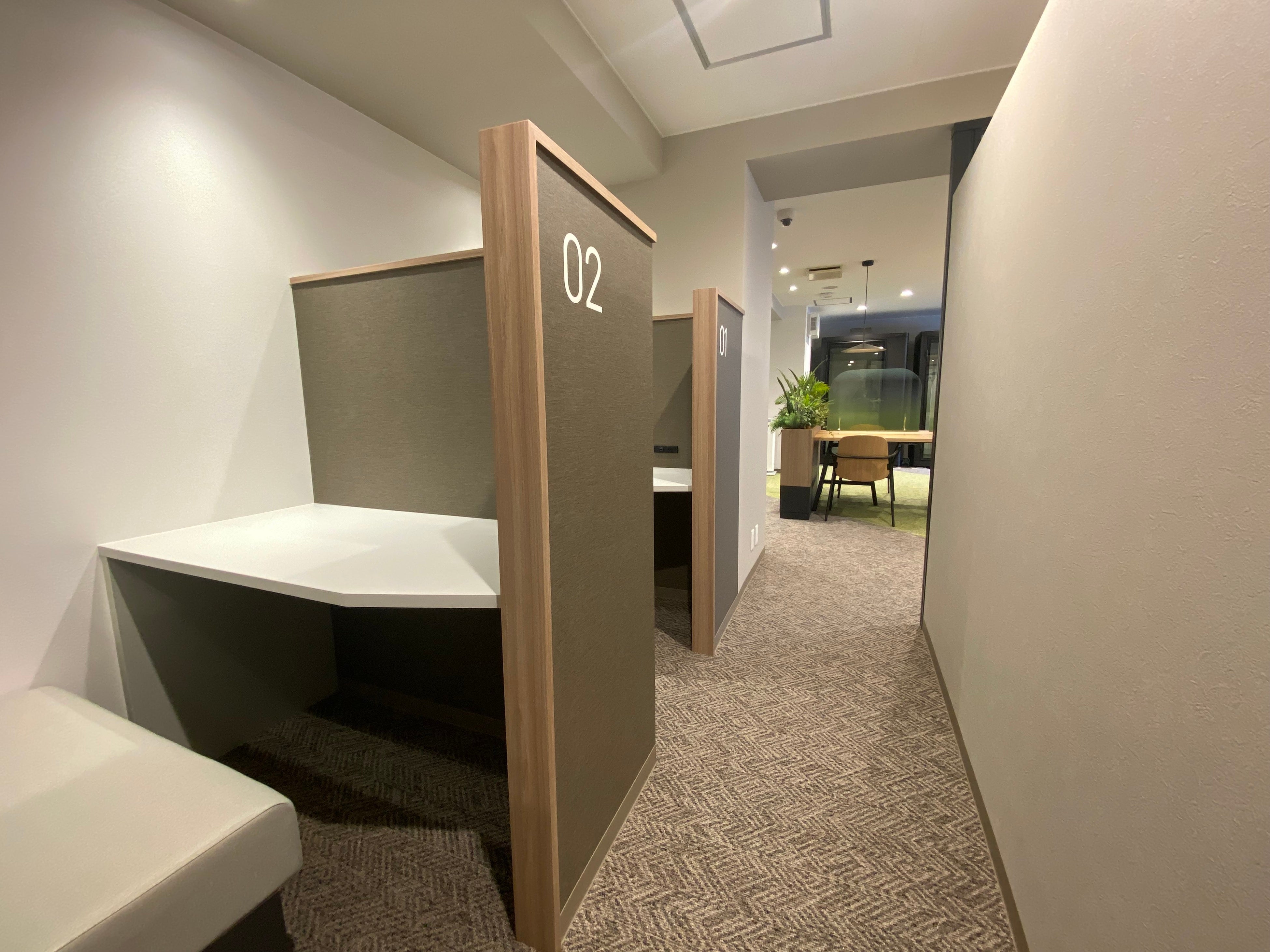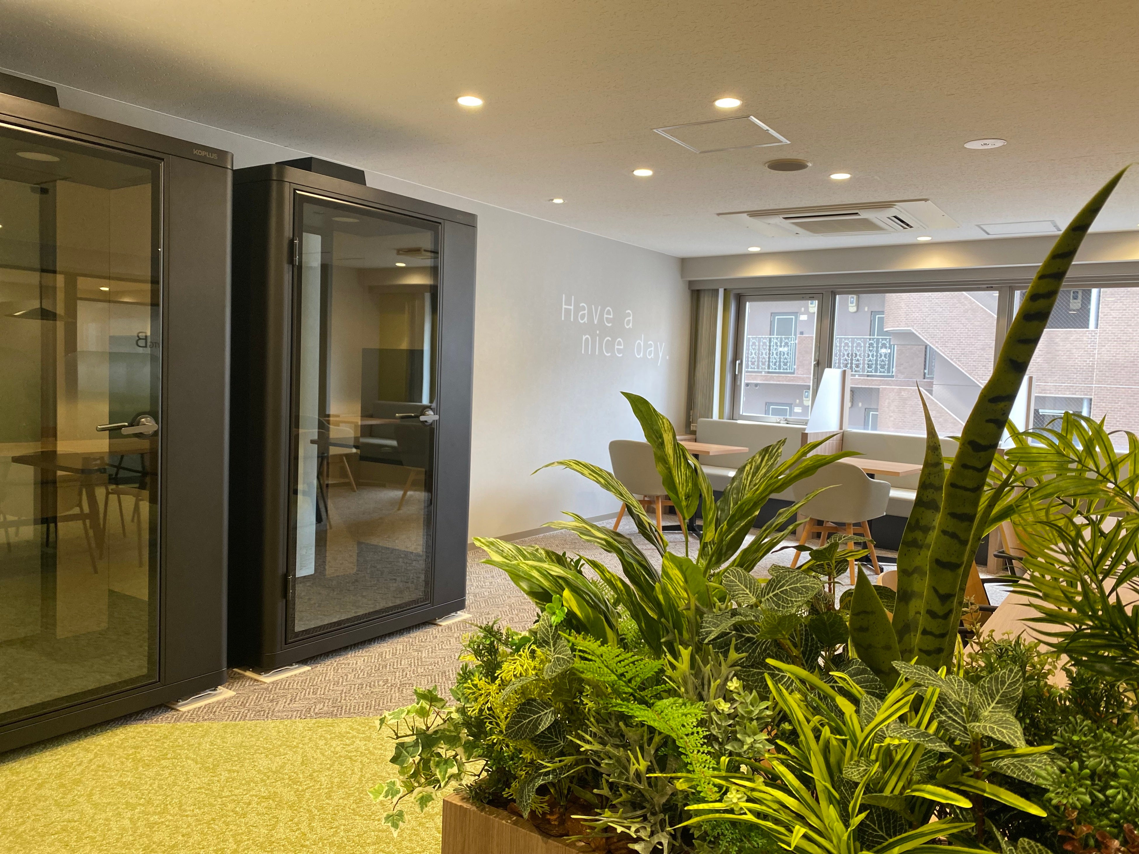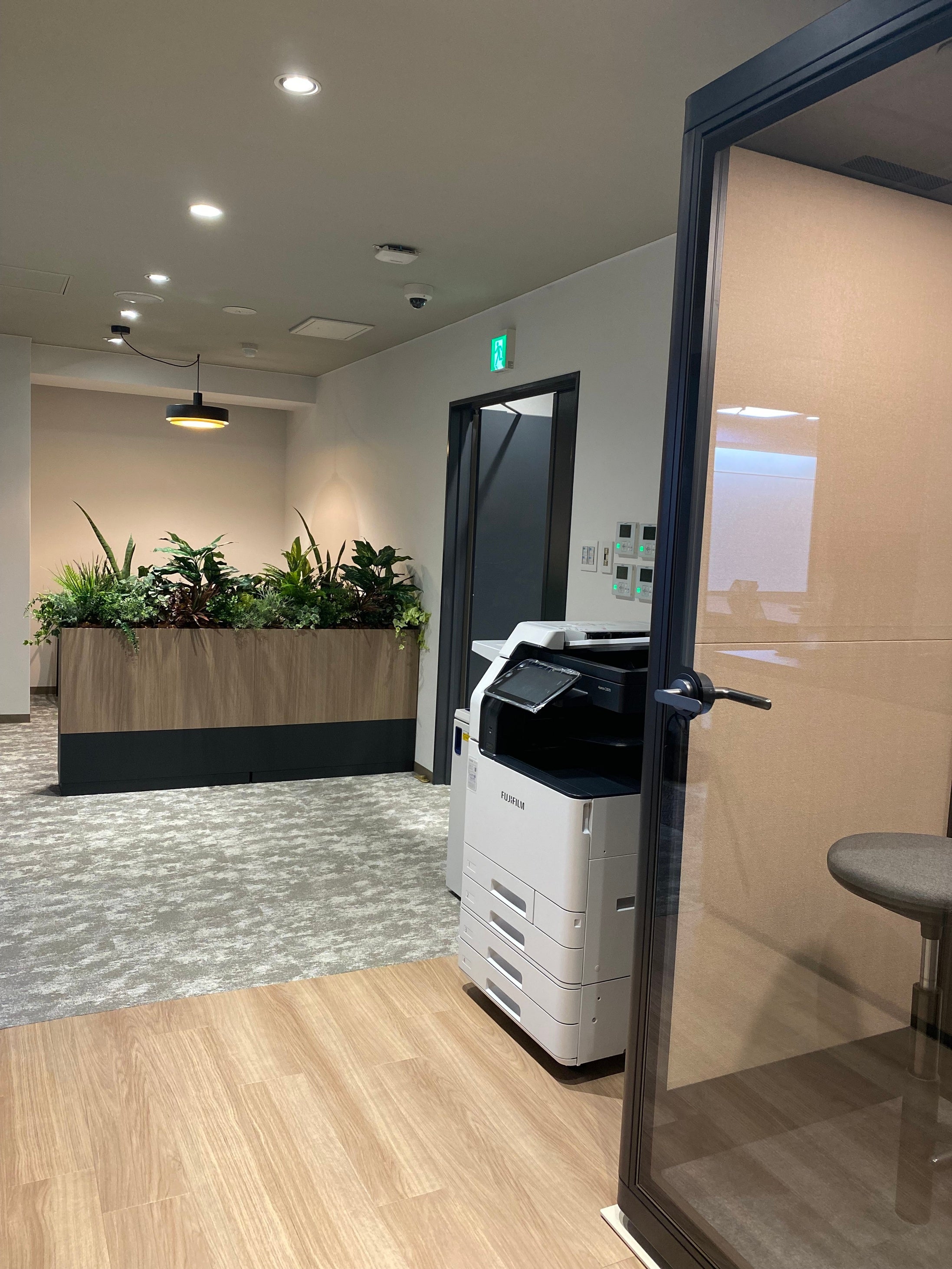 2Fセットアップオフィスには、エリア共用の印刷コピー機とWEB面談用のフォーンブース、4人掛けオープン応接セットを完備
