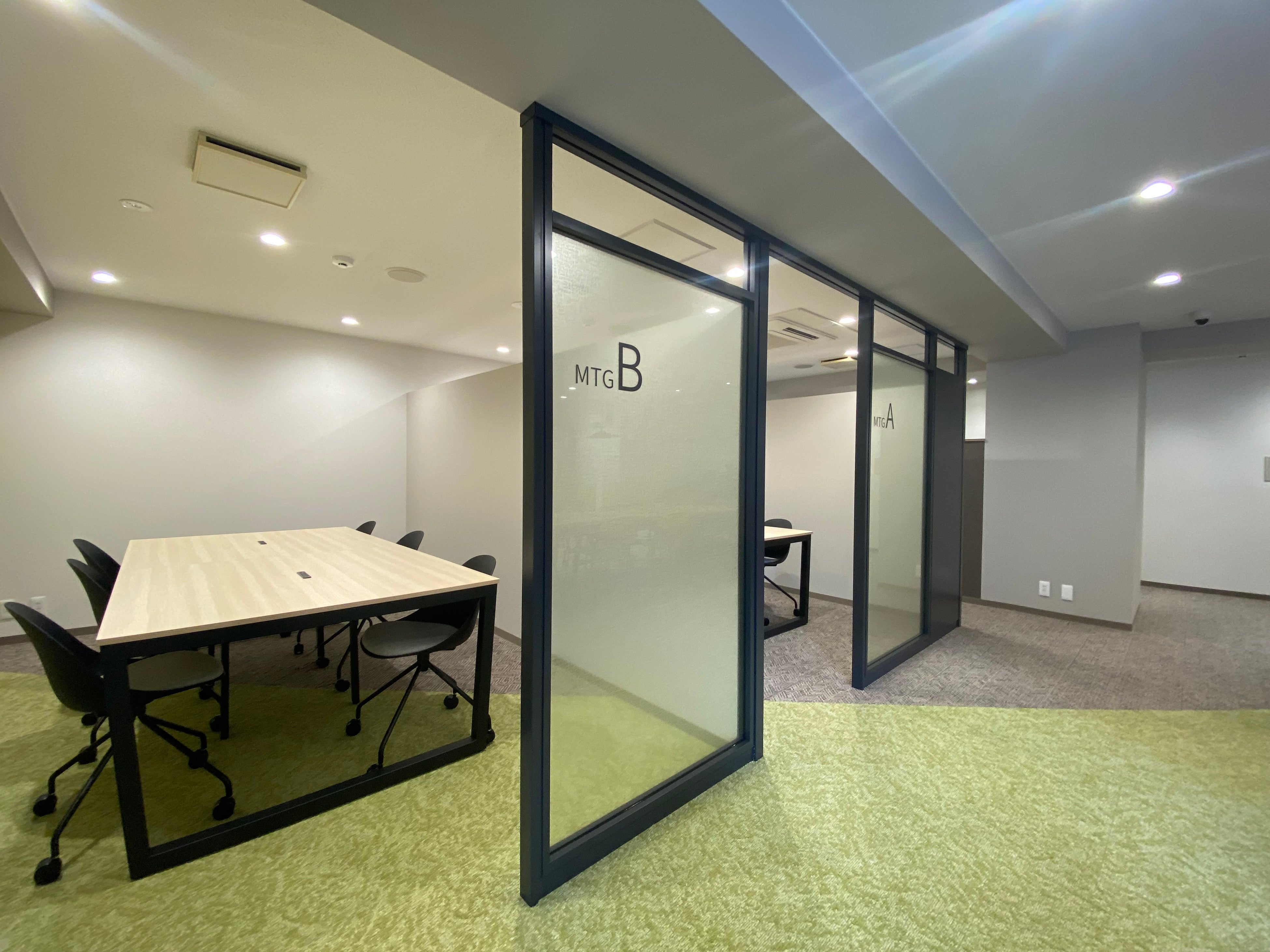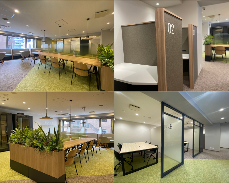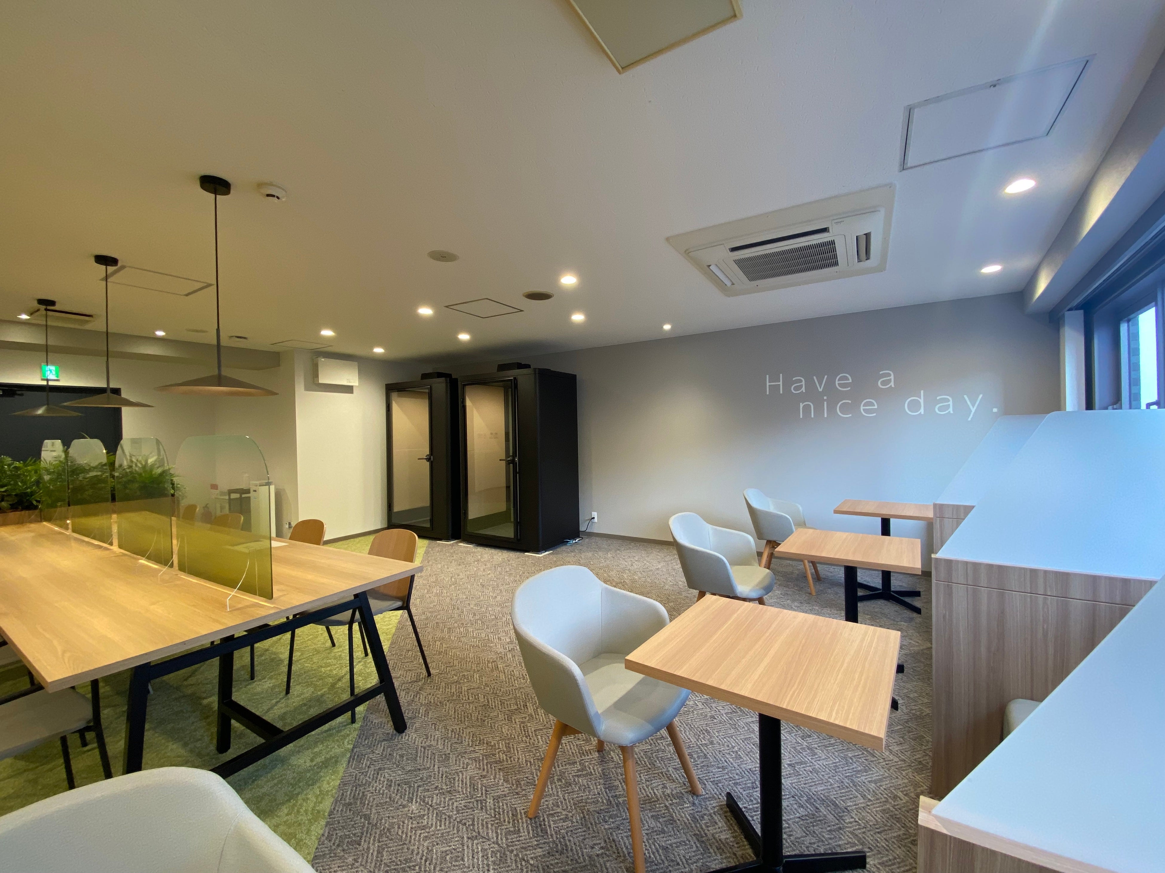 2Fセットアップオフィスには、エリア共用の印刷コピー機とWEB面談用のフォーンブース、4人掛けオープン応接セットを完備