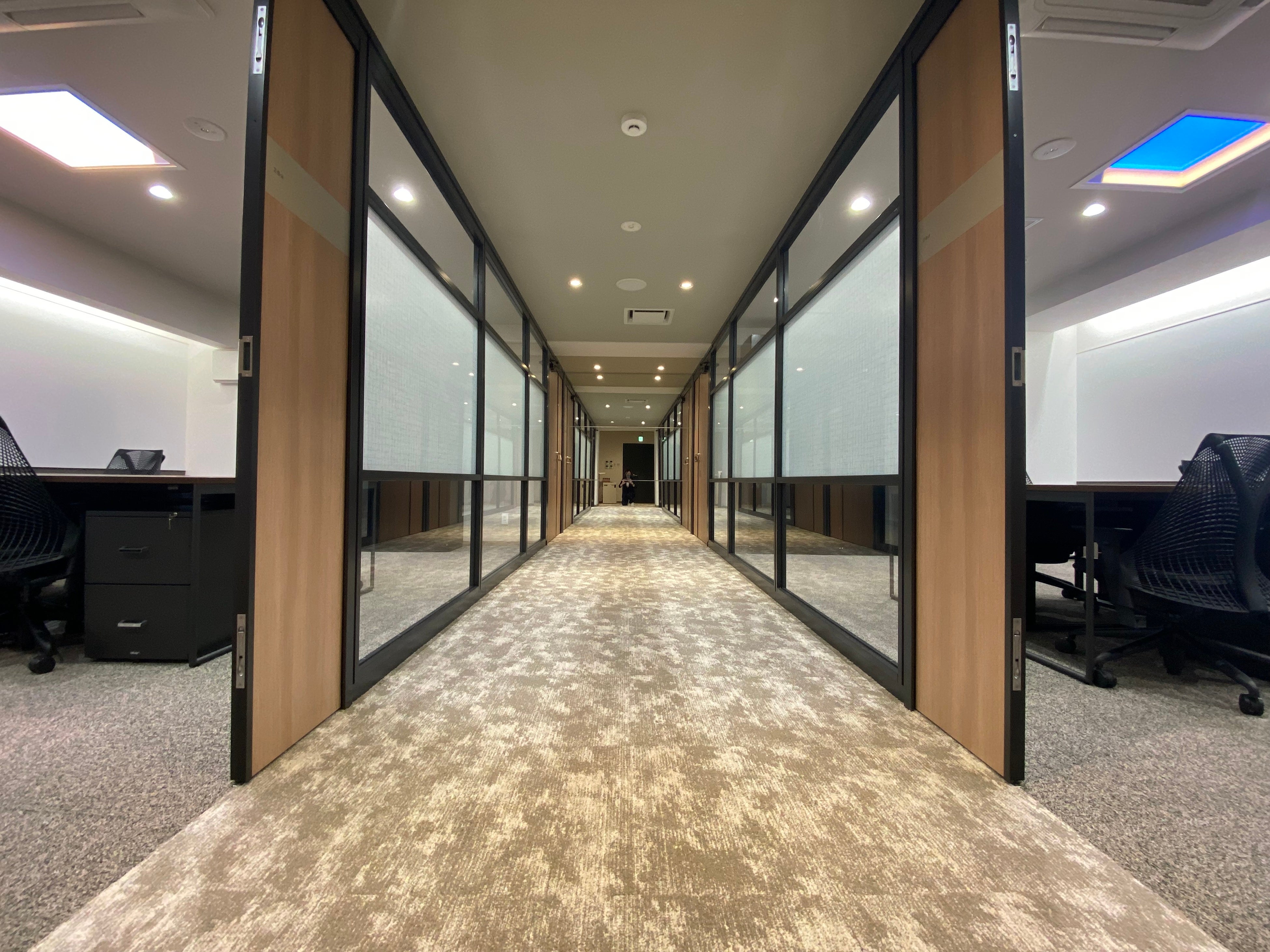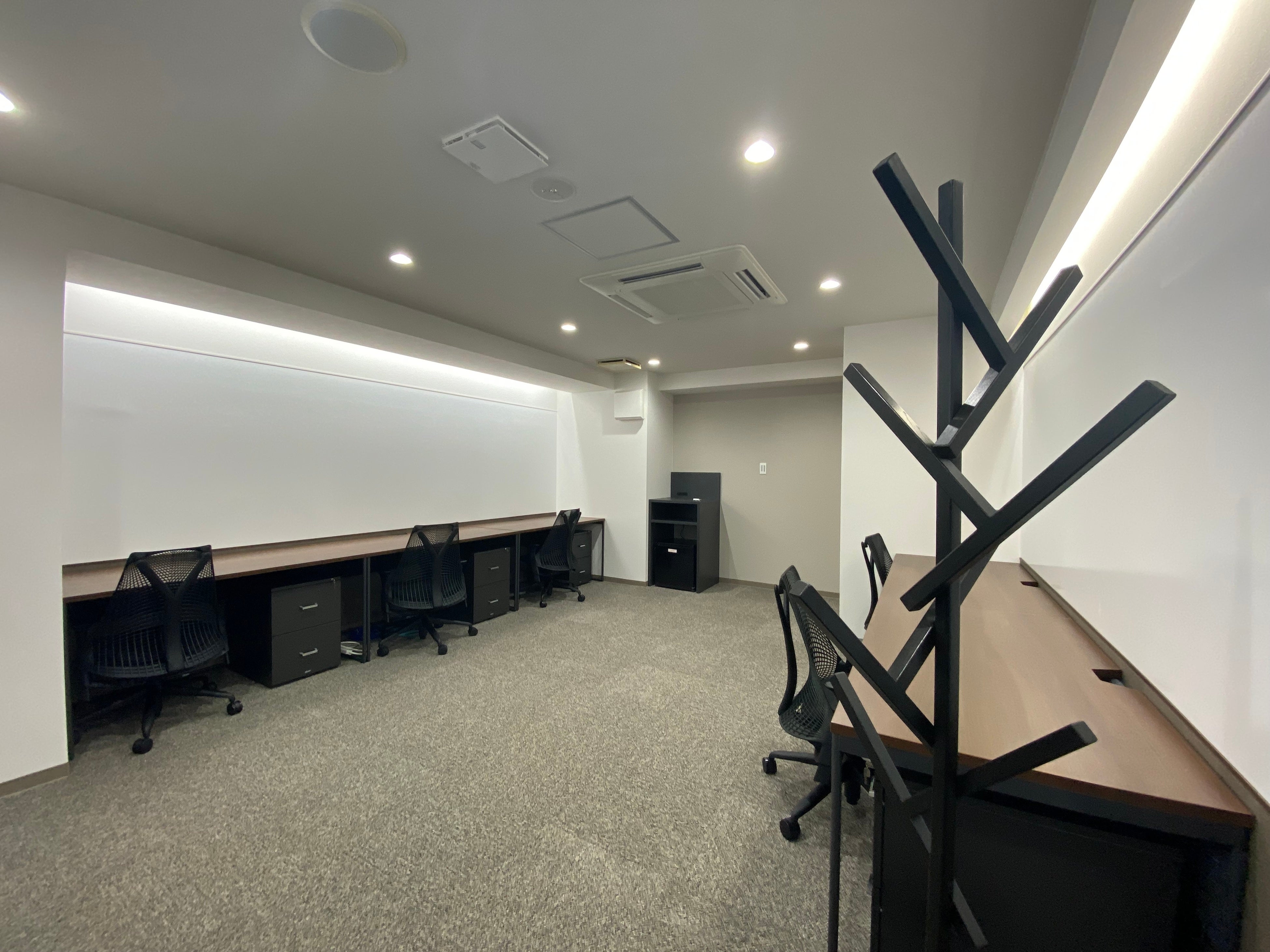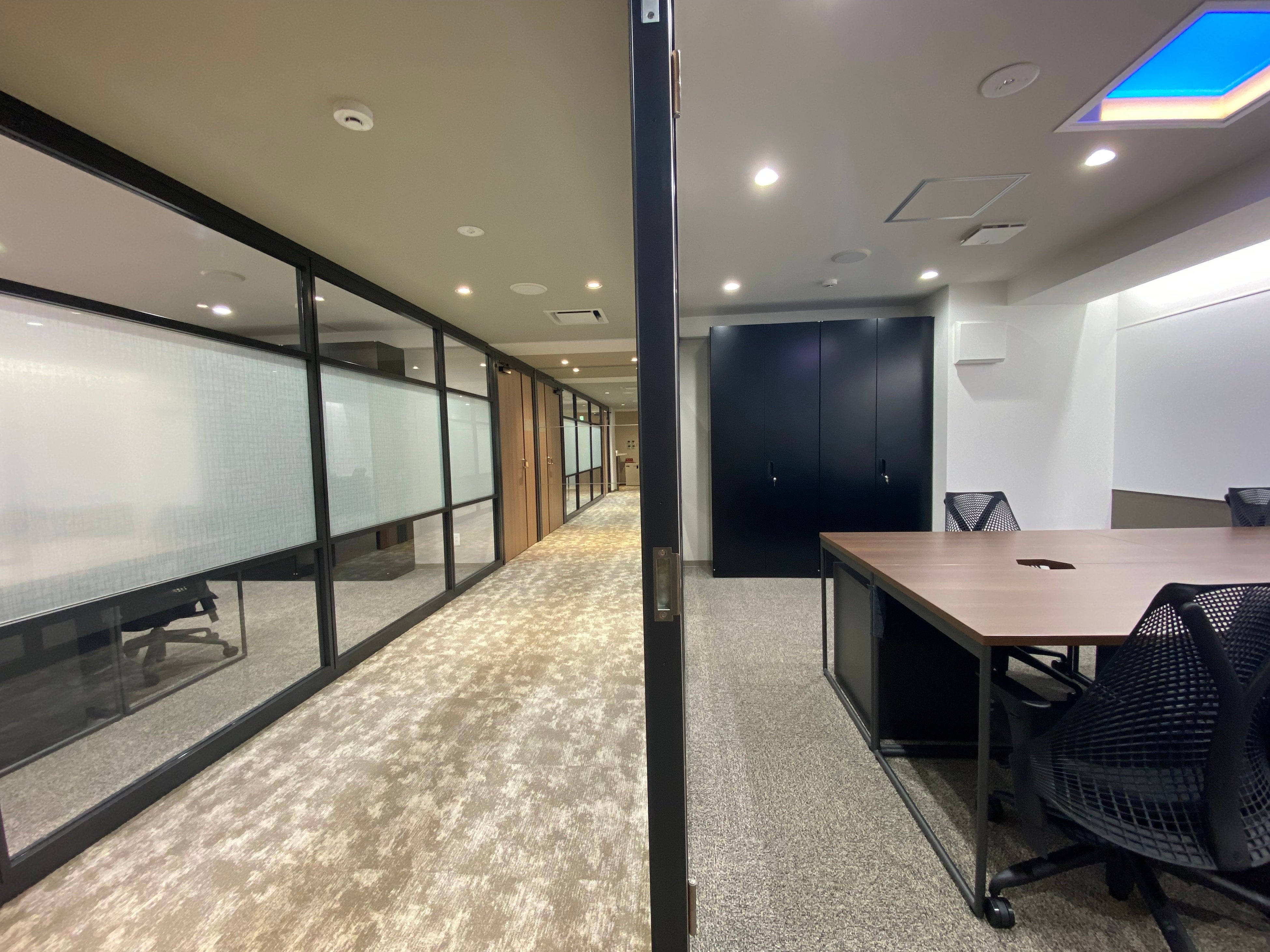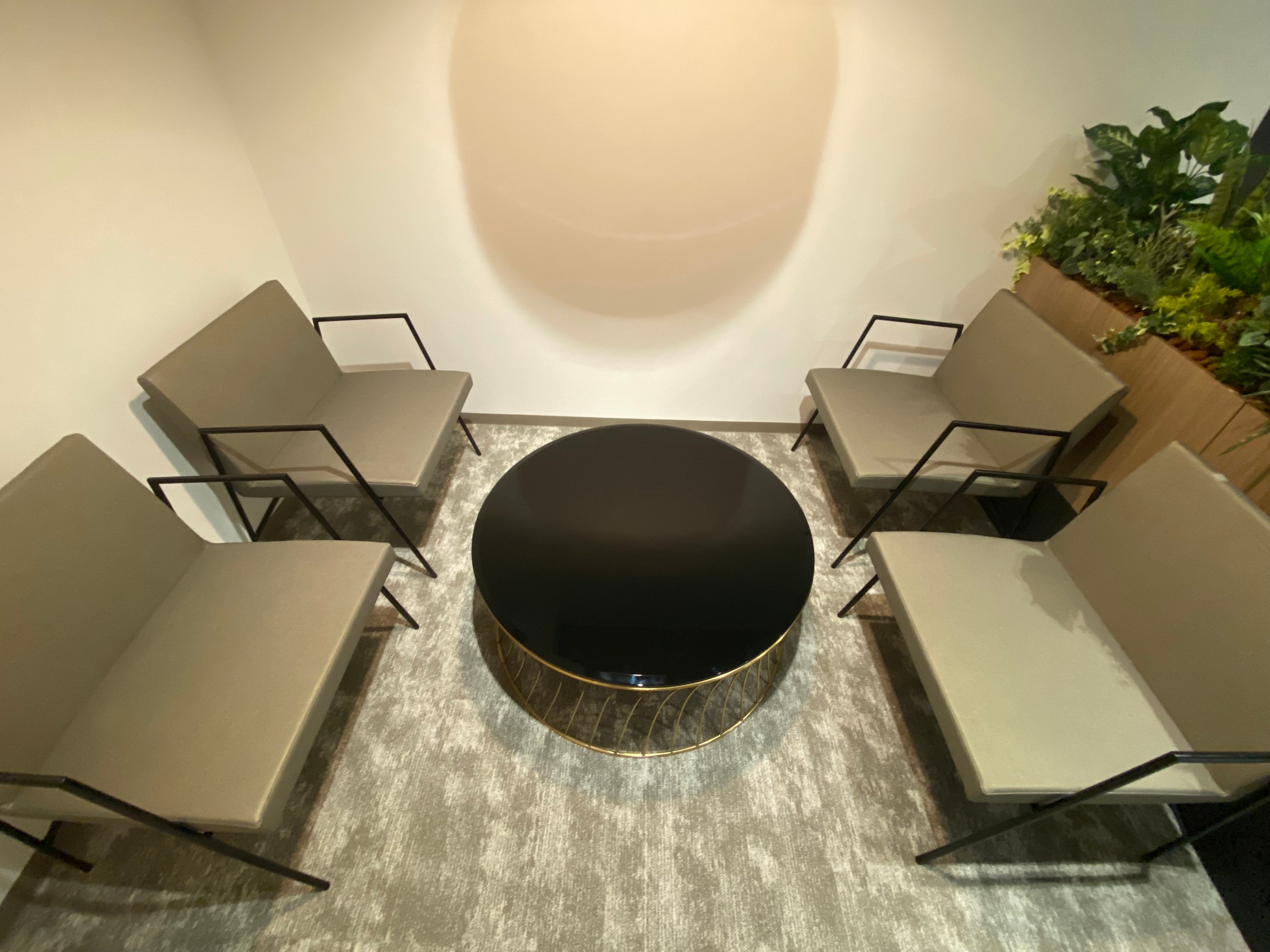 2Fセットアップオフィスには、エリア共用の印刷コピー機とWEB面談用のフォーンブース、4人掛けオープン応接セットを完備