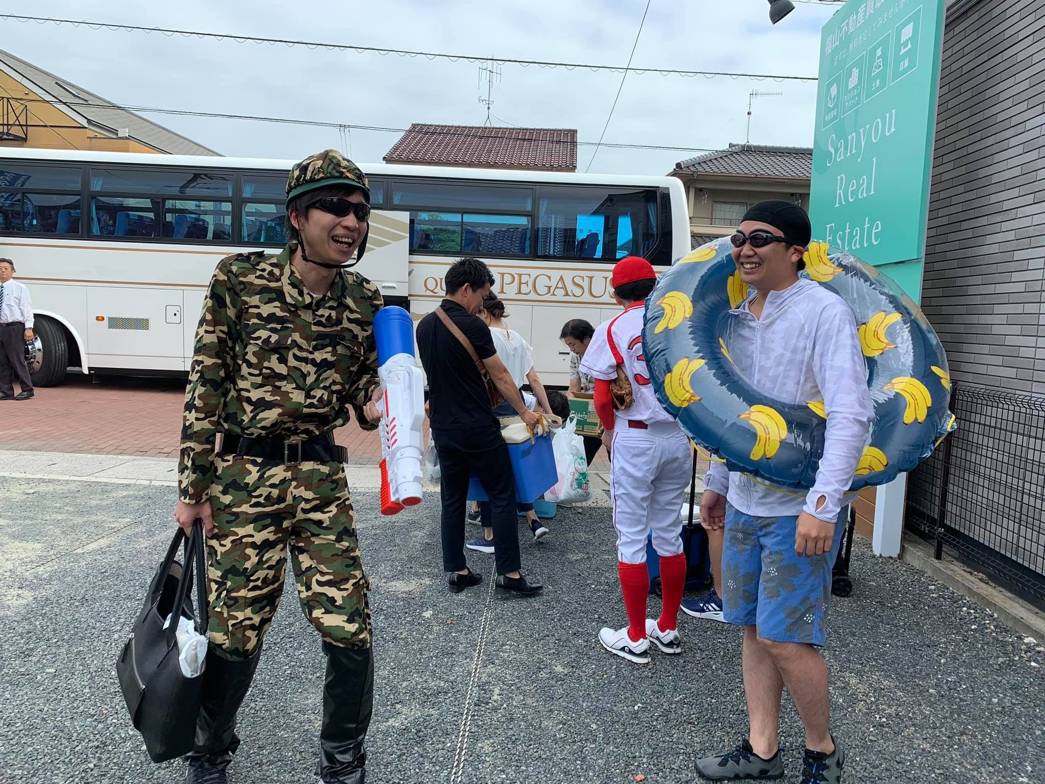 盛り上げる為に仮装をして参加してくれる人もいます。写真は「今日はサバゲーでしたよね?」「え?今日海水浴でしたよね?」「いや野球大会って聞きました」ってみんなの笑い声が響き渡ります。
