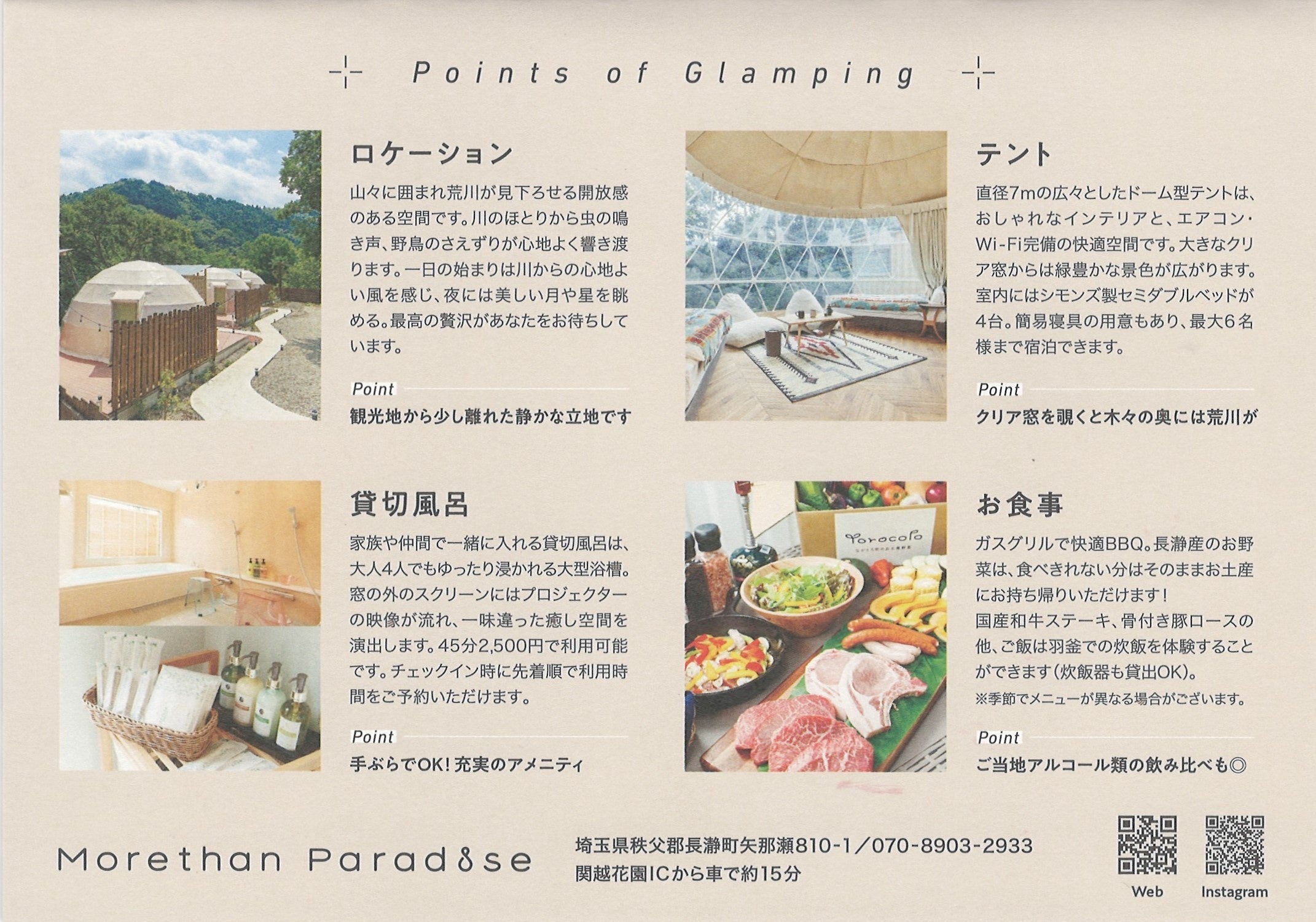 都心から1時間程度で【グランピング・テントサウナ・ラフティング・カヤック】のアウトドア体験が出来、秩父・長瀞の観光や2022年10月にOPENした花園プレミアムアウトレットへのアクセスも良い☆Morethan Paradise☆でもっと自分とすごそう!