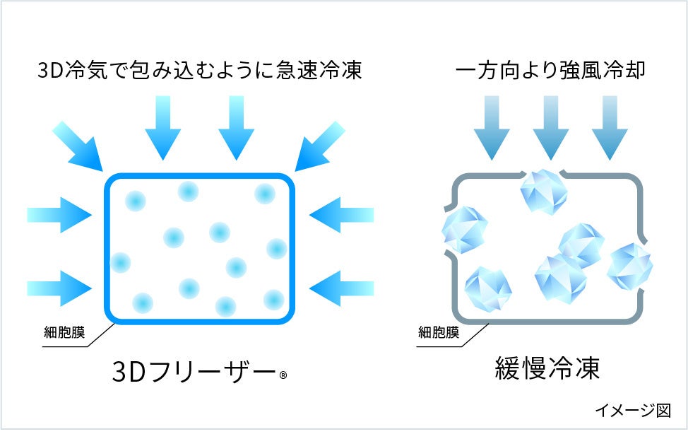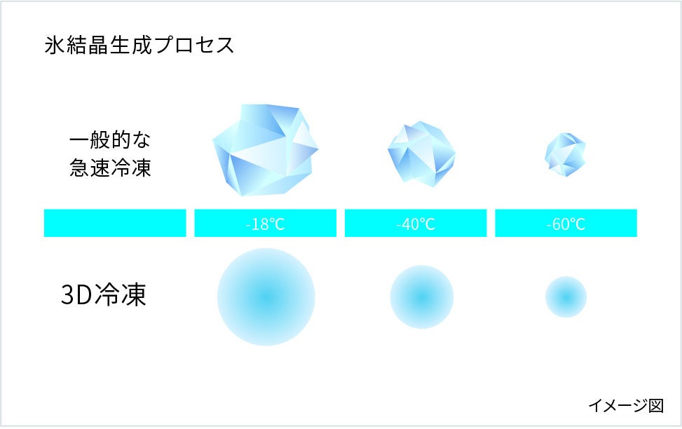 〜0では株式会社コガサンの3Dフリーザー®︎を導入しており、野菜に含まれる水分を3D冷気で瞬間的に冷凍することで、品質を損なわず、氷の形で細胞壁を破壊することもありません。そのため、解凍しても「べちゃっとしない冷凍野菜」となるのです。