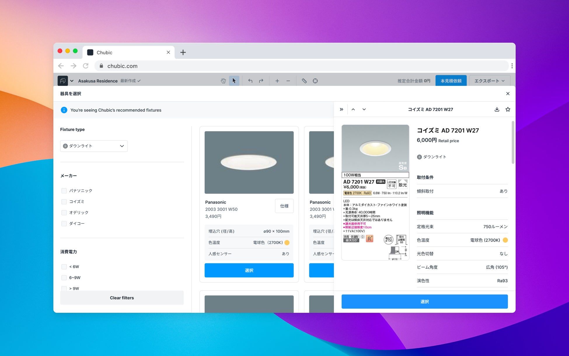 CHUBICは、照明設計から計画の立案、実装に至るまでをサポートするオールインワンツールを目指しています。このアップデートでは、照明器具を直接CHUBICから購入することが可能になり、お客様の手間を削減し、プロジェクトの効率を大幅に向上させることを実現しました。