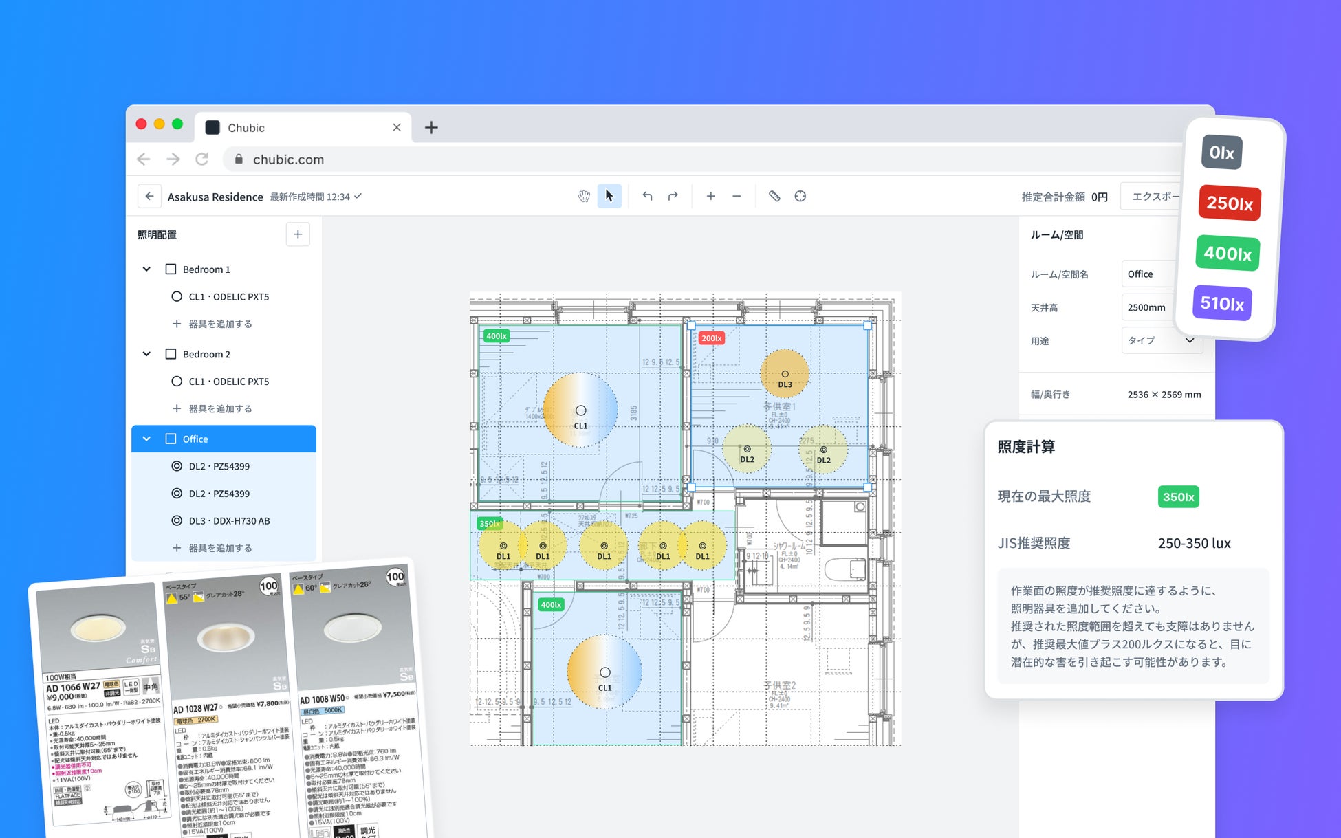 CHUBICは、照明計画の作成、照度計算、照度分布図の作成までをブラウザから簡単に行える、照明設計支援ツールです。 ユーザーは平面図をアップロードするだけで、照明器具の配置ごとに照度を自動で計算し、その照度が適切かどうかを色で示してくれる照度計算機能など、従来専門家に外注していた作業を手間なく内製化することを可能にするツールです。