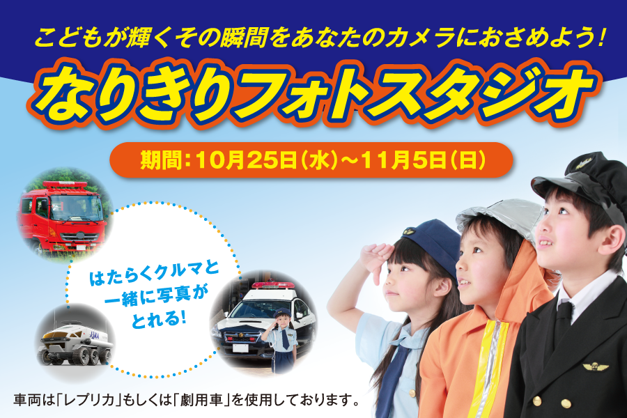 参加費 | 500円(税込み)※お子様1名あたり/120分 *コスチュームへのお着替えなしであれば、当日予約なし、年齢制限なしで自由に 働くクルマと撮影いただけます。ただし撮影は予約者が優先となります。 *車両は「レプリカ」もしくは「劇用車」を使用しております。 |