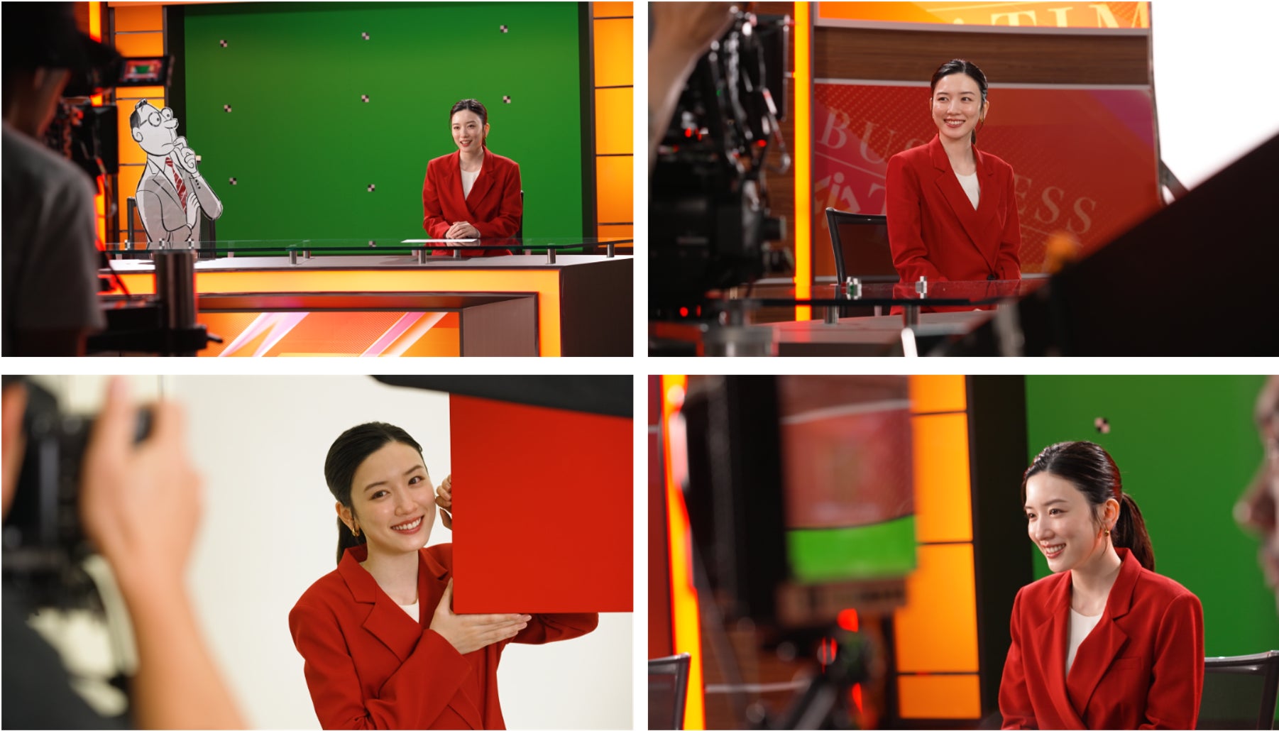 永野芽郁さんは、赤のスーツをピシッと着こなし、にこやかに現場入り。今回のCMは、ビジネス番組をイメージしたセットの中、永野さんがキャスター役としてドコモビジネスの魅力をナビゲートするシーンを撮影しました。