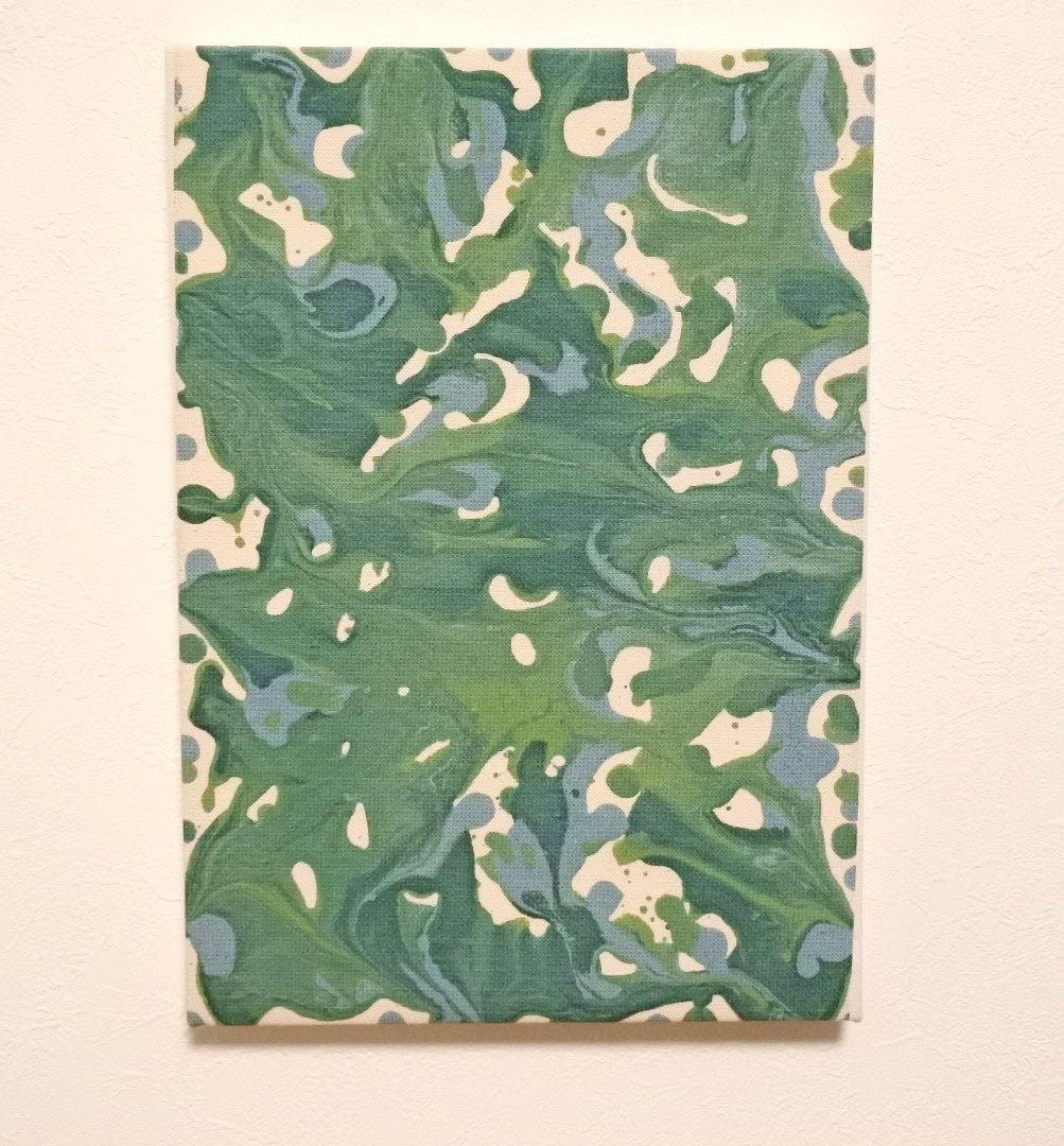 この作品は、「フルイドアート」、「ポーリングアート」とも呼ばれ、液状にした絵の具の流動性を楽しみ、色同士が混ざり合うことなく、マーブリングさせたり分離させたりして、表現します。緑色と青色の絵の具を数種類流し込んで描きました。六甲の瑞々しい森と降り注ぐ木漏れ日をイメージして制作しました。偶然浮かんだ模様や緑の鮮やかさが目を引く作品になったと思います。