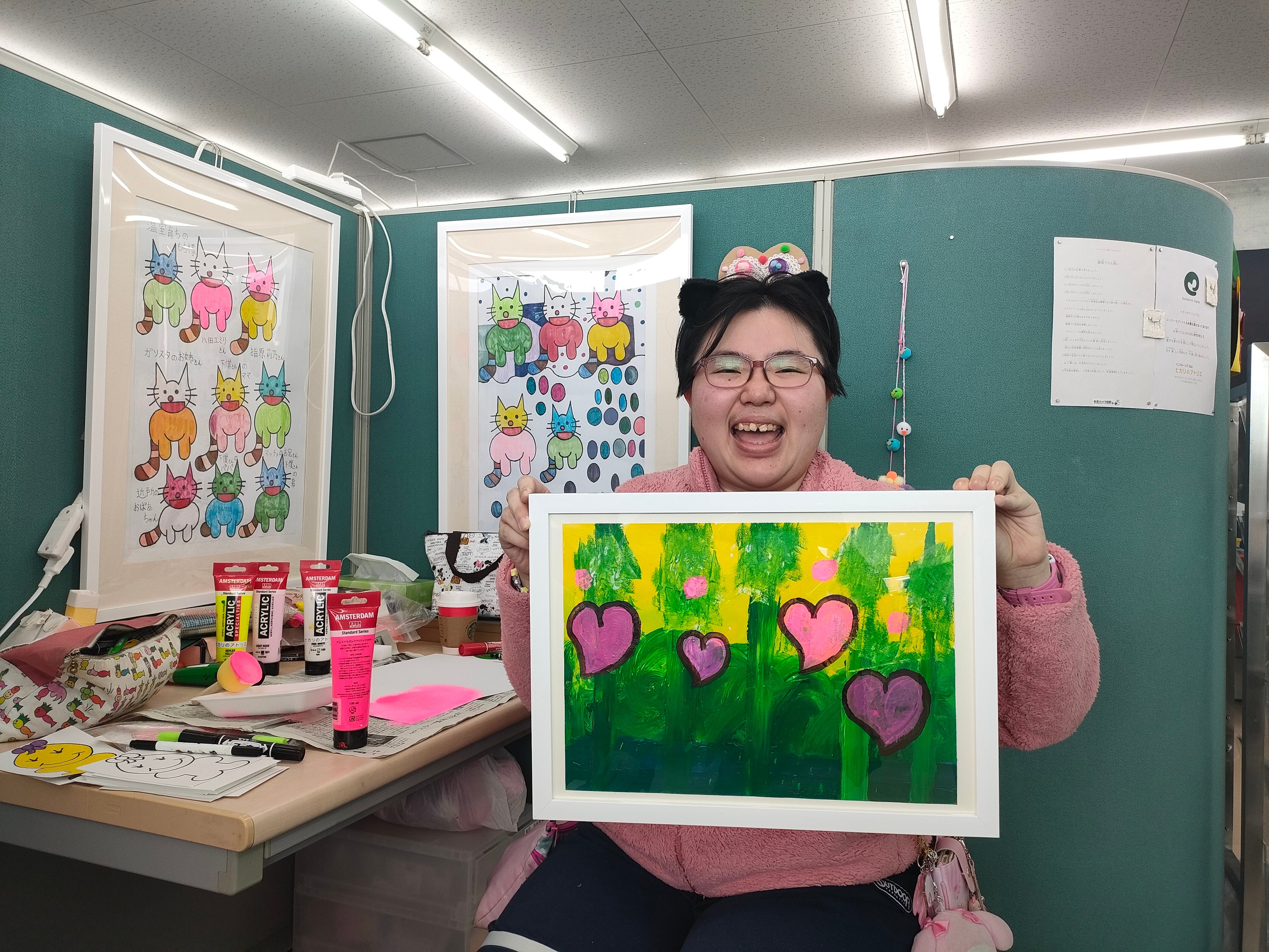 この度、多様性に富んだ包摂的な社会の実現や、森林・里山・生物多様性保全の重要性を考える機会創出に向けた取り組みとして、神戸市内で未利用であった間伐材をアップサイクルした紙糸「TSUMUGI」で織られた生地に障がい者アート作品を掛け合わせた「紙糸キャンバス」を製作しました。企画にあたってはプロジェクトメンバーからの依頼を受けて、ヒカリのアトリエ所属作家2名が「神戸・六甲山」をテーマに、瑞々しい緑の森をイメージし、閃いたことや森への想いを表現しました。また、製品化にあたっては生地だけでなく、会員であるSHAREWOODS.(神戸市中央区、代表:山崎正夫)制作による未利用な六甲山の間伐材を使用したフレームなど、自然環境をより身近に感じていただけるような工夫をしています。