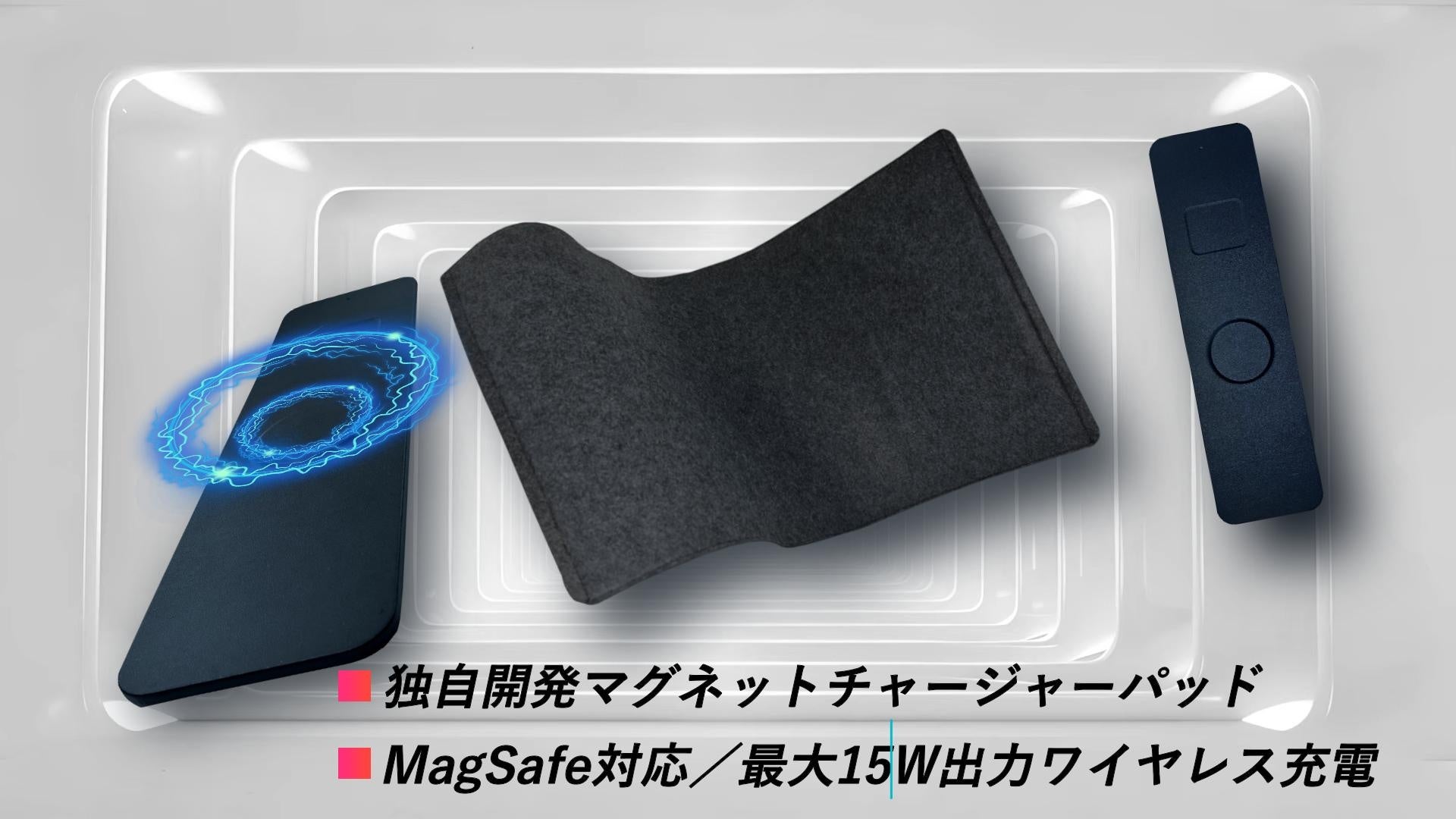 チャージパッドは自由自在に配置を変えられる。MagSafe採用のため、スマートフォンも充電したままでOKだ。