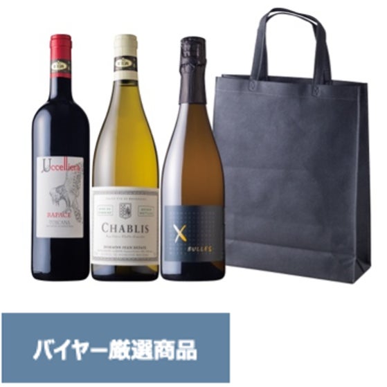 赤ワイン「ウッチェリエラ ラパーチェ(イタリア)」、白ワイン「ジャンデフェ シャブリ(フランス)」、スパークリングワイン「Xビュル メトッド アンセストラル」のお買い得な3本セット(定価約15,400円相当)。大人数が集まる年末年始の手土産としてもおすすめです。