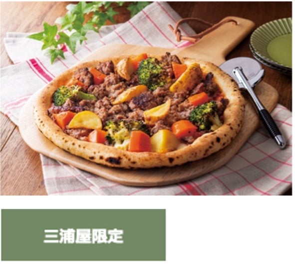 三浦屋の精肉部の一切冷凍していない自慢のフレッシュな挽肉を使い、店内で製造したハンバーグをモチモチ食感の生地にのせてじっくりと焼き上げました。肉や野菜など食材の旨味がたっぷり詰まったピザです。