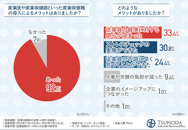 次に、産業医や産業保健師を導入したことによりメリットがあったか伺いました。