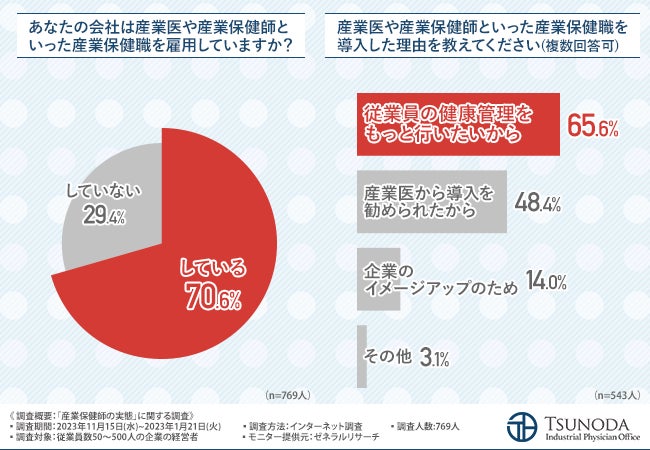 今回の調査で、従業員数50~500人の企業の約7割が産業医や産業保健師といった産業保健職を雇用していることがわかりました。