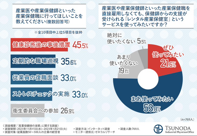 今回、「従業員の健康リスク管理」に関する調査を実施した愛知つのだ産業医事務所株式会社では、産業保健師業務と顧問産業医を組み合わせた産業保健サービス「レンタル産業保健室」(https://rental-sangyouhoken.com)を提供しています。