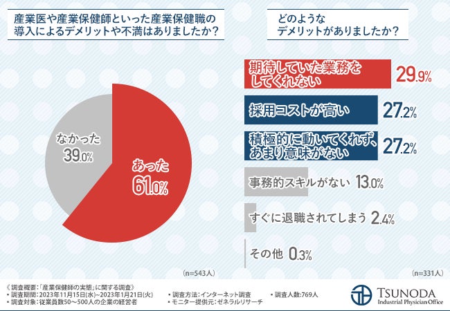 「産業医や産業保健師といった産業保健職の導入によるデメリットや不満はありましたか?」と質問したところ、約6割の方が『あった(61.0%)』と回答しました。